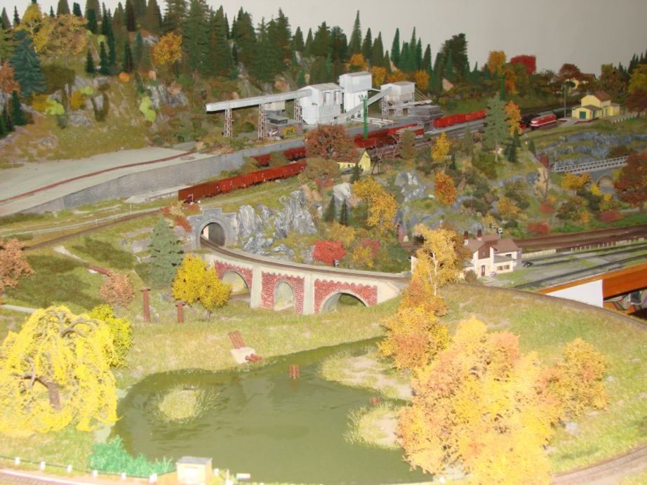- sokkal szebb, valósághűbb lenne, ha egy kisebb patak, vagy folyó folyna egy innen nézve szép kanyarulattal, és két vasúti híd menne át felette. Egy ott, ahol most is van, egy meg ott, ahol amúgyis van egy bal/jobb ív a két vágányban, közötte az egyenes szakasz alatt. (Igazából azt a kjétvágányos állomást én elhangynám, és egy sima megállóhelyet tennék oda.) |