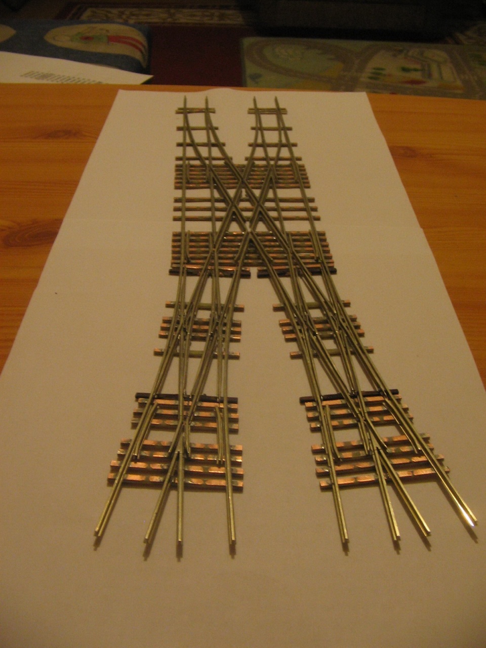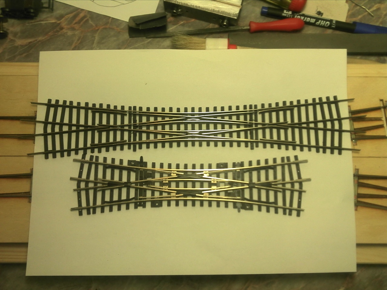 Az elmúlt egy hétben nem sokat tudtam hozzátenni a két angolos hózentrógerhez, így csak ma barkácsoltam rajta. Örültem, hogy végre befejeztem a vágányzatot, akkor vettem észre, hogy az egyik angol belső csúcssínei lemaradtak! BakkeR!!! Viszont megoldást találtam a belső keresztezéseknél lévő vezetősínekre. Ide CODE 100 profil esetén nem fér be rendesen egy saját profilból készített vezetősín, mint a Tillig profil esetén, így megpróbáltam CODE 80-as profilból, ami vasasgabri N-es váltóiból maradt, és igen tetszetős, és főleg jól működő végeredményt kaptam!