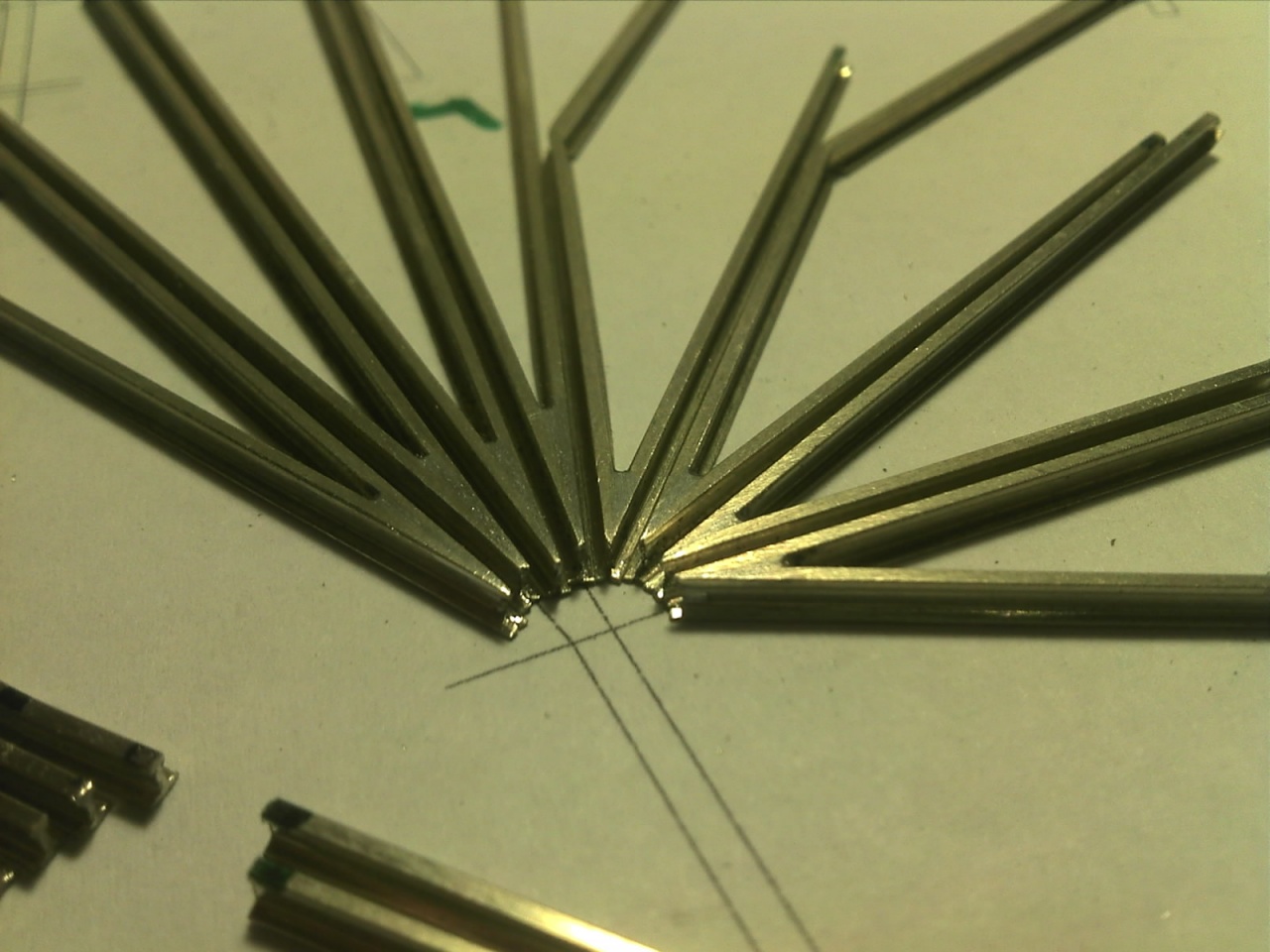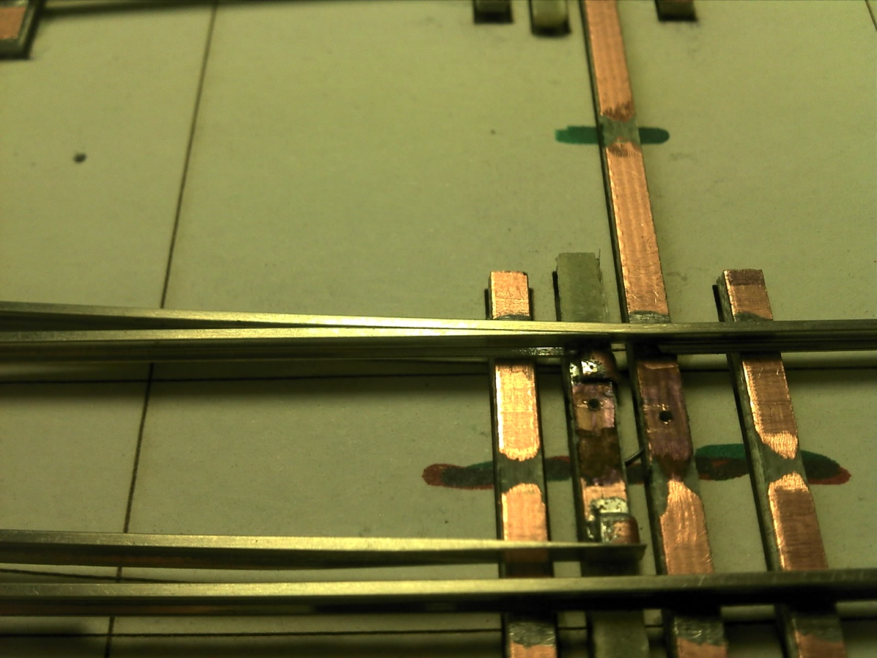 Még emberi időben értem haza, úgyhogy befejeztem a vágányzat fix részeit. Már csak a csúcssínek mozgó részének elkészítése van hátra. Tillig profilból könnyen lehetne folyamatos csúcssínes verziót készíteni, de ezt csuklópontos megoldással kell elkészíteni, mert egyenlőre csak tesztvágányzatban lesz, felülről, kézzel állítva. |