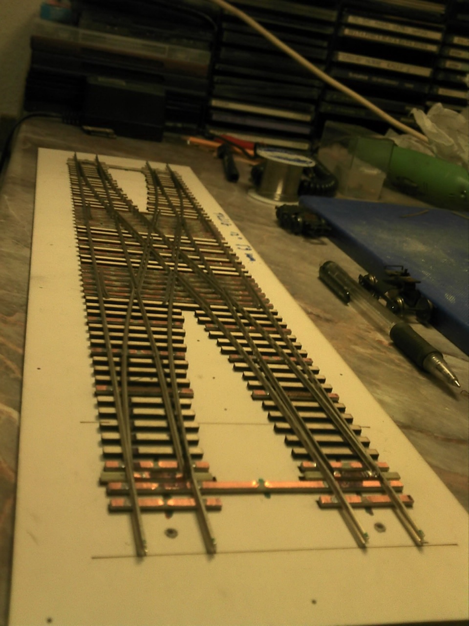 Én ezeket nem azért töltögetem fel ide, hogy dicsérjetek, hanem hátha kedvet kap valaki help-ez kollégán kívül is, és megpróbál házilag váltót készíteni. Nem olyan ördöngősség, egy egyszerű kitérőt mindenféle speckó szerszám nélkül is össze lehet hozni. Az első váltómat egy kézi csiszolóval és egy reszelővel készítettem el, mechano íves sínből. Nem lett túl szép, de tökéletesen működik. A képen a mellette lévő már egy tökéletes 12 fokos váltó, pedig azt sem sablonban építettem.