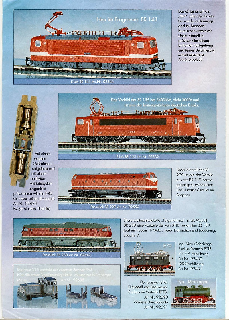 Pedig a legutolsó BTTB prospektusban (1993) újdonságként volt egy fénykép az új E44 mozdonyról, ilyen motortengelyre szerelt csiga hajtással, tehát ők ezt kitalálták, biztos, hogy ekkor még az utolsó szoc. idők gyártmányai voltak.és a Tillig érában láttam viszont ezt a megoldást, csak akkor Bühler 3 pólusu motorral.