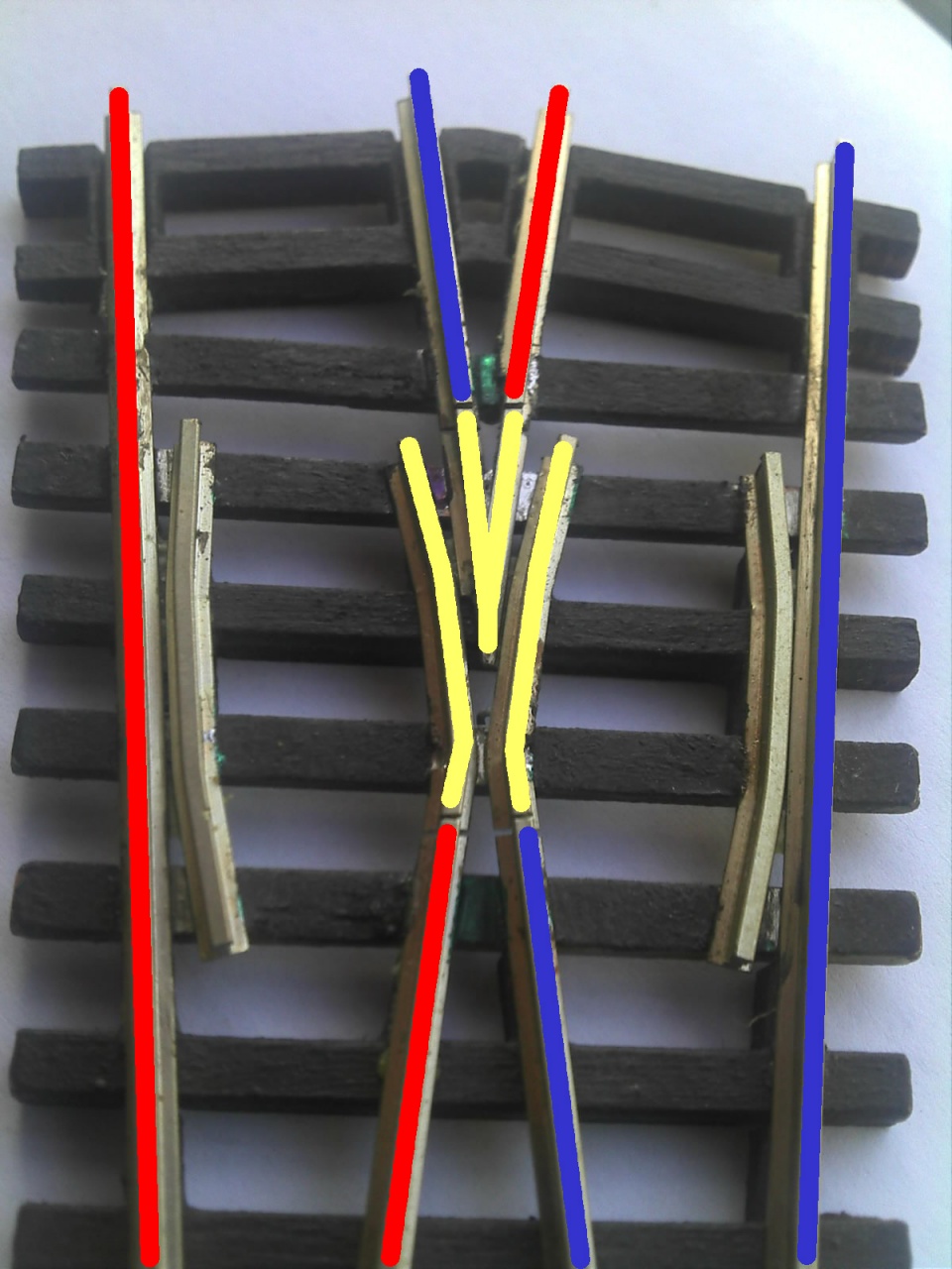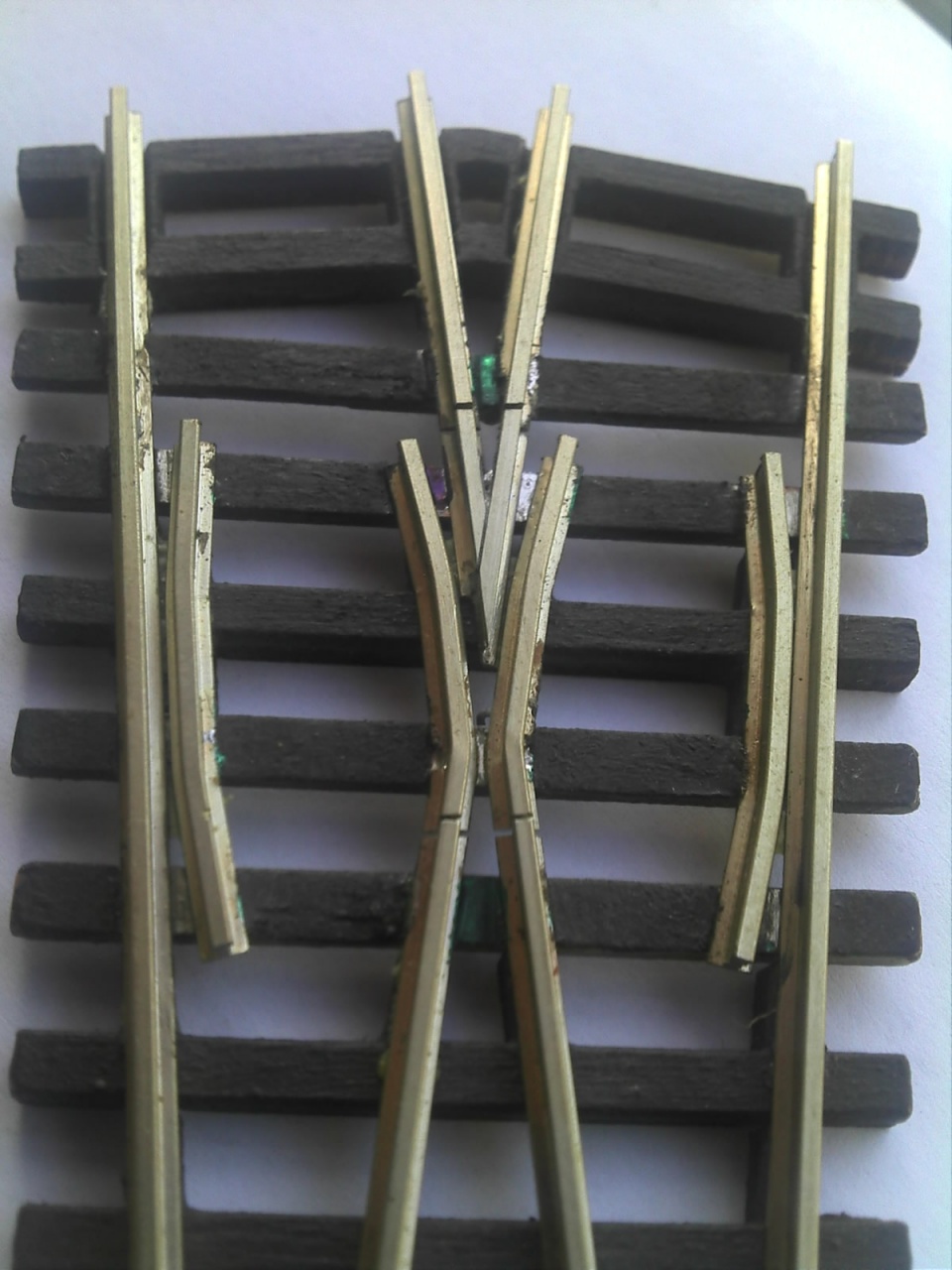 Ez a gyárin duplán biztosított , mert a csúcssín a külső sínre zárva kap áramot , vagyis a polaritás nincs jelen benne ellentétes kitérő állásnál és ráadásul a kerékterelő rész is műanyag . A csúcssínek meg műanyaggal vannak mozgatva. Én többek között ezért is nézem csodálkozva ezeket a nyáklapra épített váltókat  De ha működik és nincs zárlat még egy 11,2 mm-es BTTB fémkerekűvel sem, vagy kikopott műanyag forgózsámolyba berakott Modmüller keréknél (ami így jobbra-balra el tud 1-1mm-t mozdulni  ), vagy az emeletes vagon középső 3 kerekű forgózsámolya alatt , akkor bocsánat a szösszenetemért .