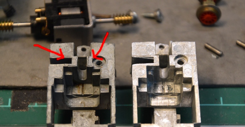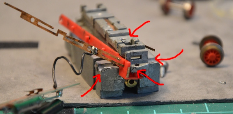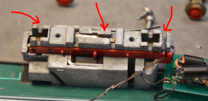 A képeken piros nyilakkal jeleztem a kritikus pontokat, ahol a fémpestis brutális módon kikezdi a szerkezetileg fontos elemeket. jelen alanynál annyira meggörbült a fémtömb, hogy a két középső, szabadonfutó kerék szorult a fészkében és nem ért le a sínre. Ergo csak a szélső, tapadógyűrűs kerékpárok érintkeztek, így gyakorlatilag zéró volt az áramszedés.