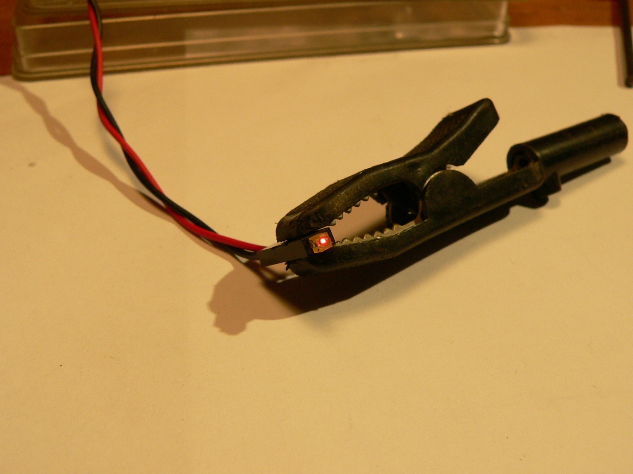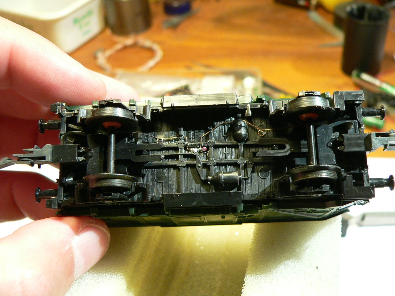 Én is elkészítettem egy zárlámpát. A LEDeket kicsit megreszeltem, hogy hasonlitson az eredetihez, majd 0,3mm CuZ (zománcozott rézhuzal) ráforrasztása, majd az egész festése. A helyét kifurtam a kocsiszekrényen, és beragasztottam.
