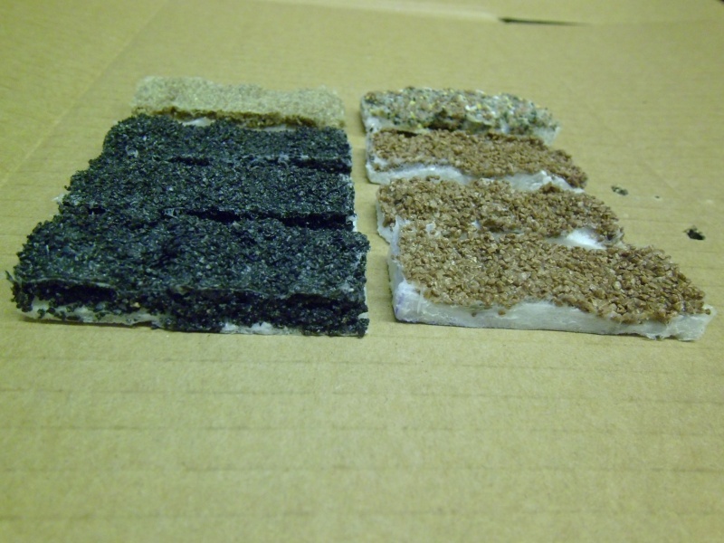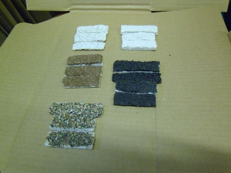 Az anyagok töltéshez való kövek, márványok, homok és egyéb kőzúzalékok lehetnek, de célom elsősorban a ragaszthatóságuk, látványuk megismerése volt, nem az élethűség. Messze vannak még a tökéletestől, azértis várom mások tapasztalatait, tanácsait, ötleteit.