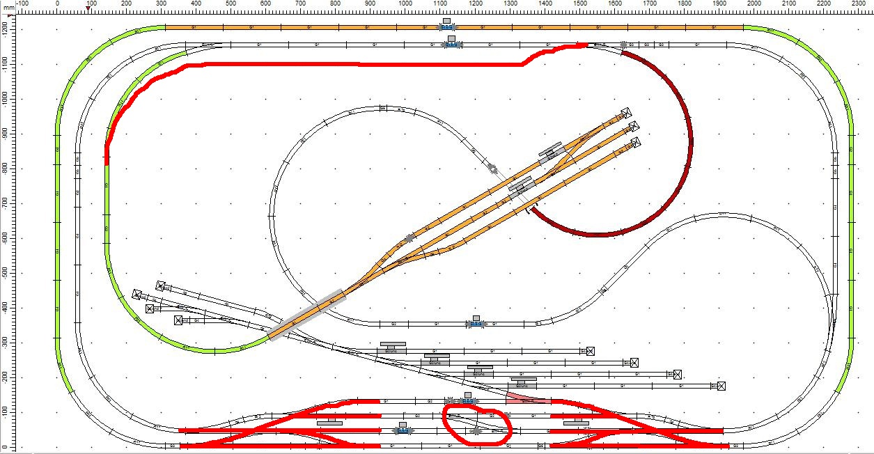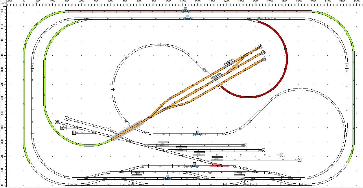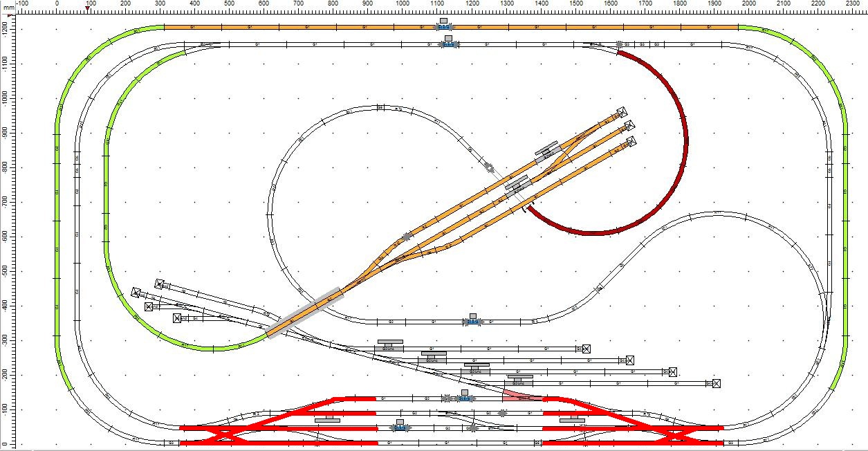 Lehet, hogy a vágánynak azt a részét egy ívvel tovább kéne vinni, befordítani függőlegesbe. Akkor a két leágazást is meg lehetne nyújtani, hogy hosszabb gépekkel is rá lehessen állni (gondolom, ez lenne a célja), és akkor a hurkot is el lehetne tolni balra, és a pirosat nagyobb ívűre csinálni, ahogy etwg javasolta.