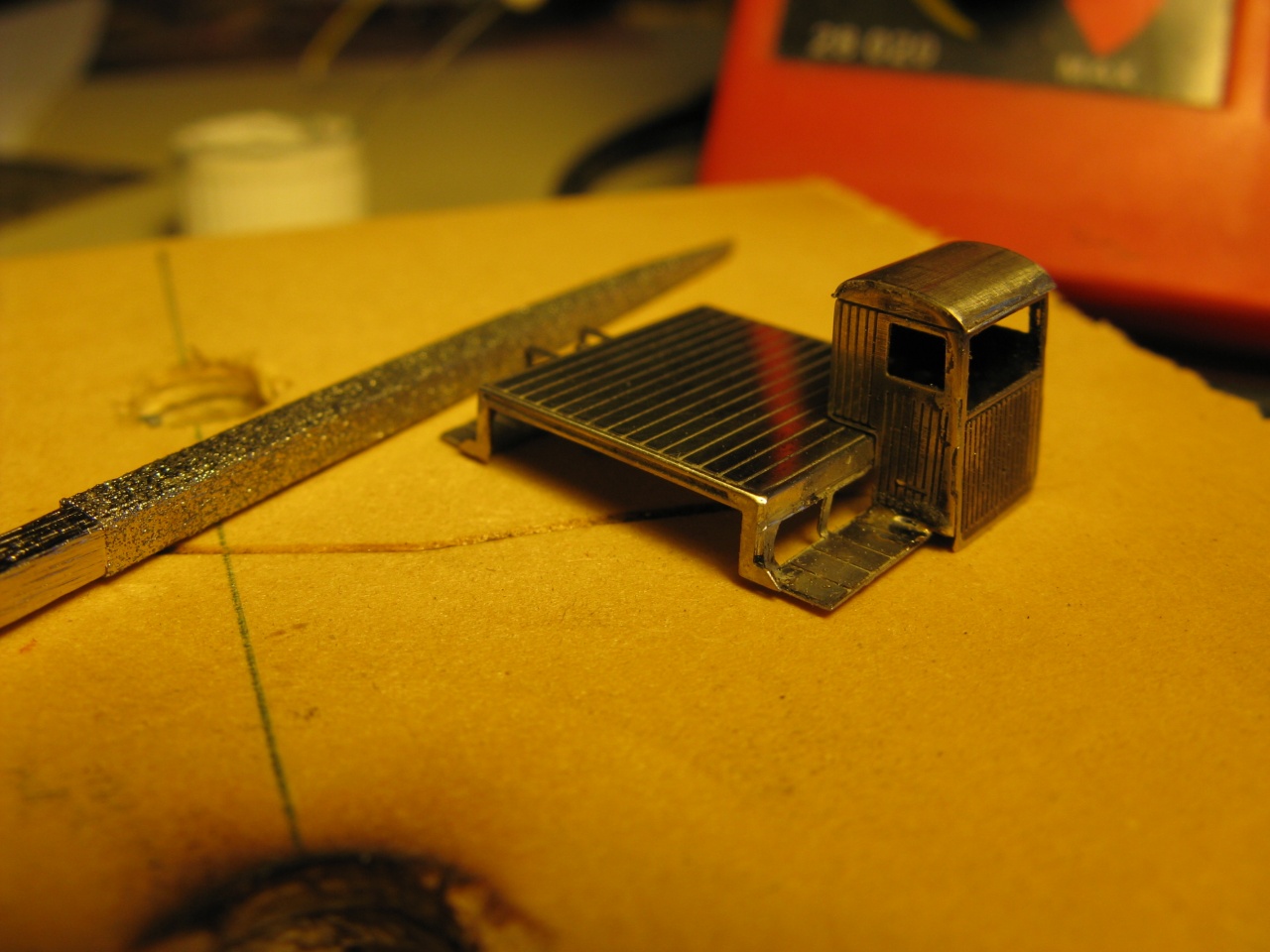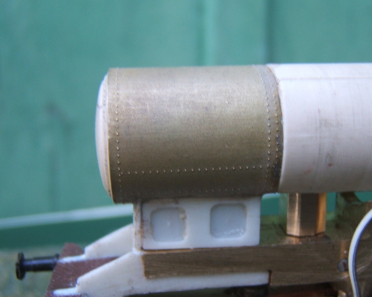Majdnem kizárólag sárgarézzel vagy alpakkával szoktunk dolgozni. Én néha használtam nagyon vékony foszforbronzot amibe könnyebb a szegecseket belenyomni, majd ezt a vékony lemezt (0.1 mm) csak felragasztom a sárgarézmodell felületére.