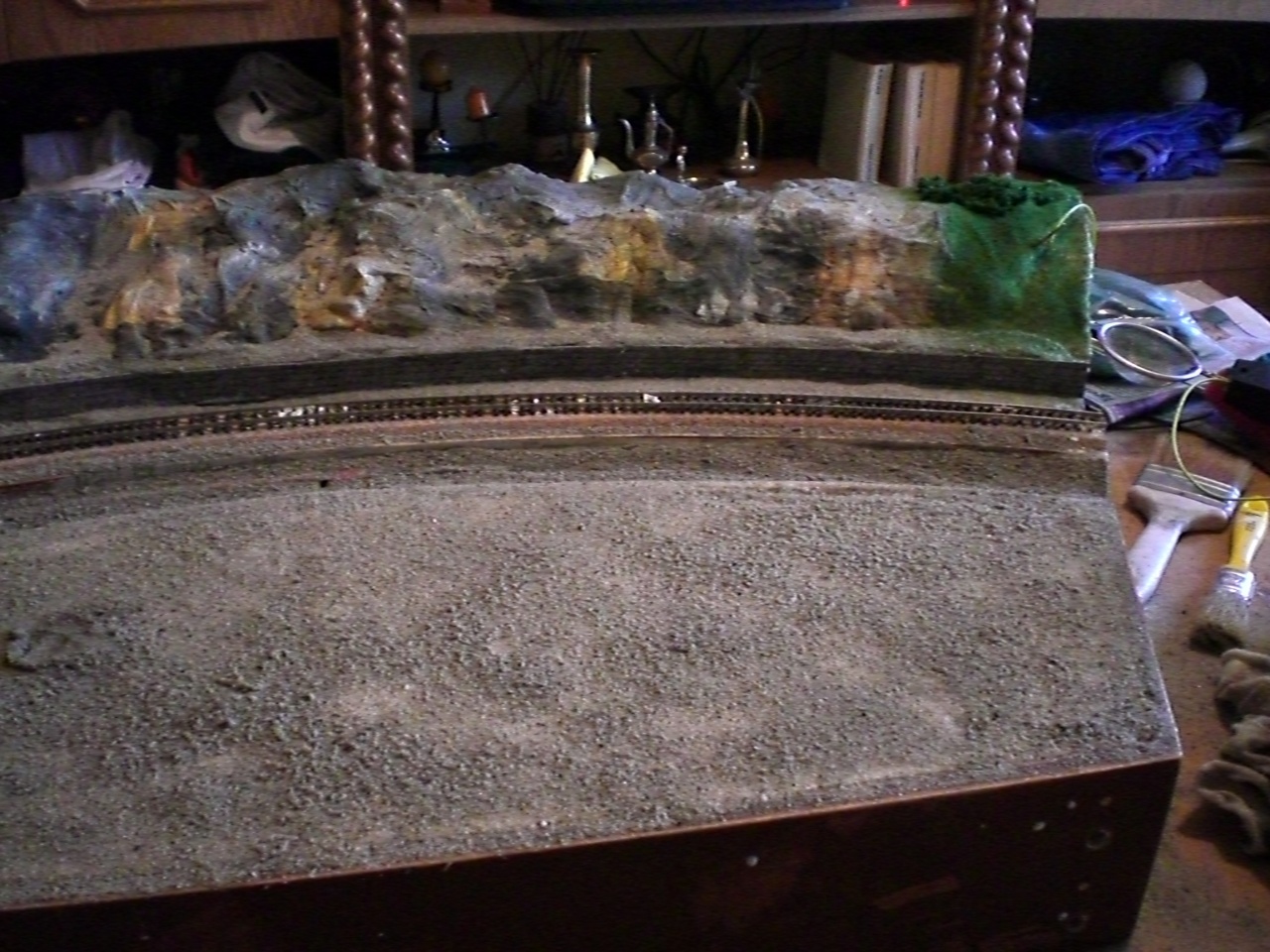 Sima fehér pattex ragasztóval van csinálva minden,csak a különböző munkafázisokhoz más-más arányban kell hígítani.Állateledeles boltokban lehet kapni különböző színű és szemcse nagyságú homokot(itt nálunk 85Ft/zacskó),azzal van megszórva a sík rész. |