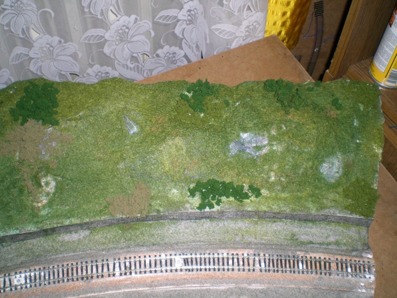 Nemcsak a ragasztót szoktam szinezni, de az alapot eleve földszinüre szoktam festeni, majd csak a száradás után jön a növényzet szorása. Nincs attól zavarobb mint a kilátszó fehér vagy zavaroszinü alap.