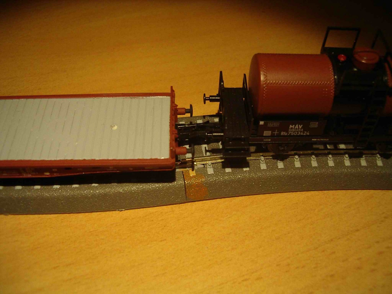 A forgóváz egyik végén kivágtam egy akkora helyet, ahová a Peho mágneses kapcsolófoglalat befér. A mélységnél kis rátartással dolgoztam, hogy biztosan ne érjen össze az ütköző a kanyarban. (utólag nézve kicsit lehetett volna mélyebbre ereszteni, de így is jó.  ) Erre felülről ráragasztottam egy kis műanyag lapocskát, majd a foglalat fém tartóját beragasztottam.