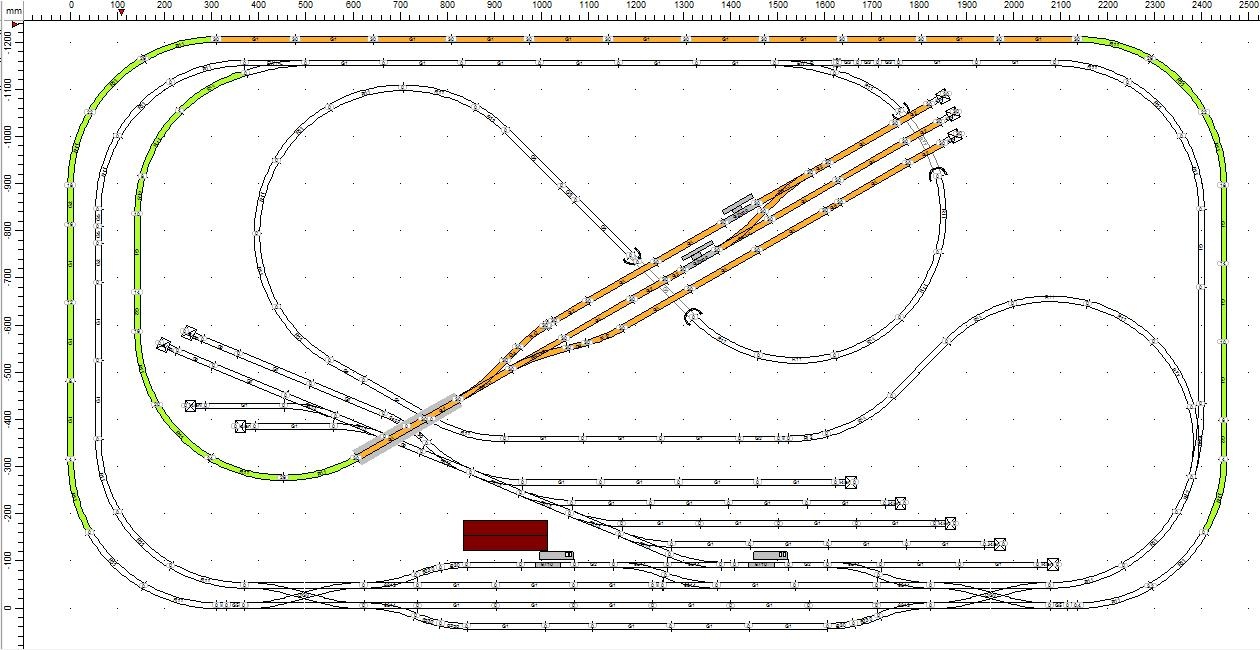 Célszerű lenne alul is egy átvezetést csinálni, mert ha a felső pu.-nál visszafordulsz, akkor utána csak úgy tudsz újra irányt váltani, hogy behúzód a szerelvényt az alsó pu.-ra, és átállsz a géppel a másik végére, Ha ott is megcsinálod az átvezetést, ahol a képen van, akkor vissza is tudod fordítani. |