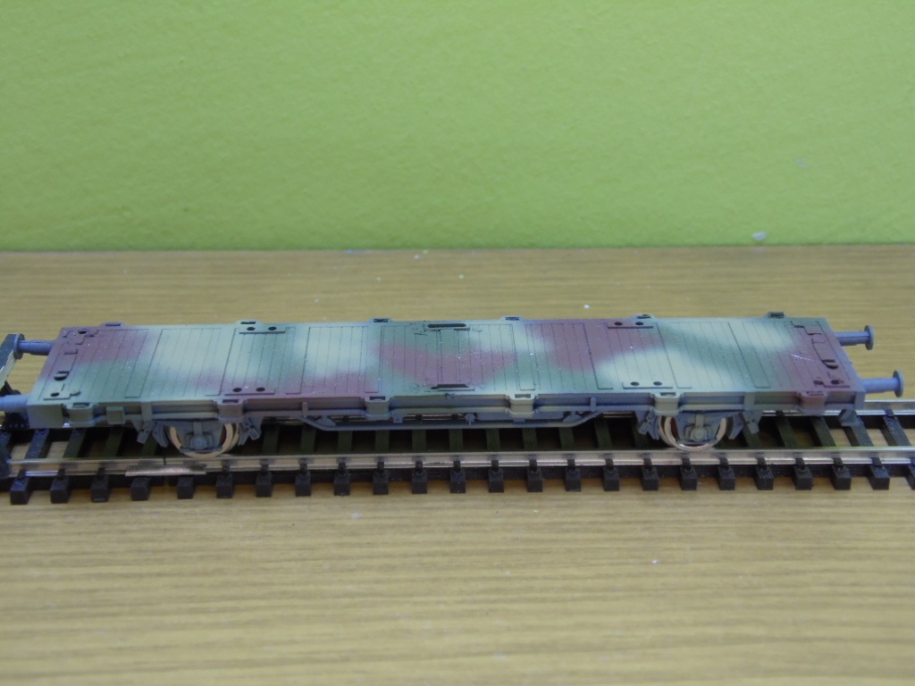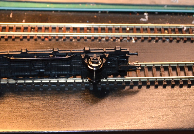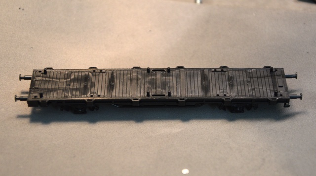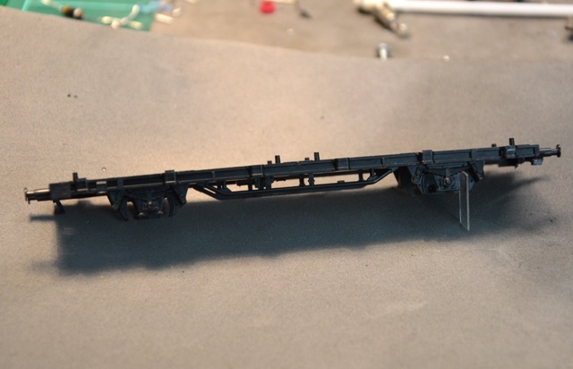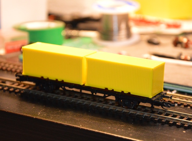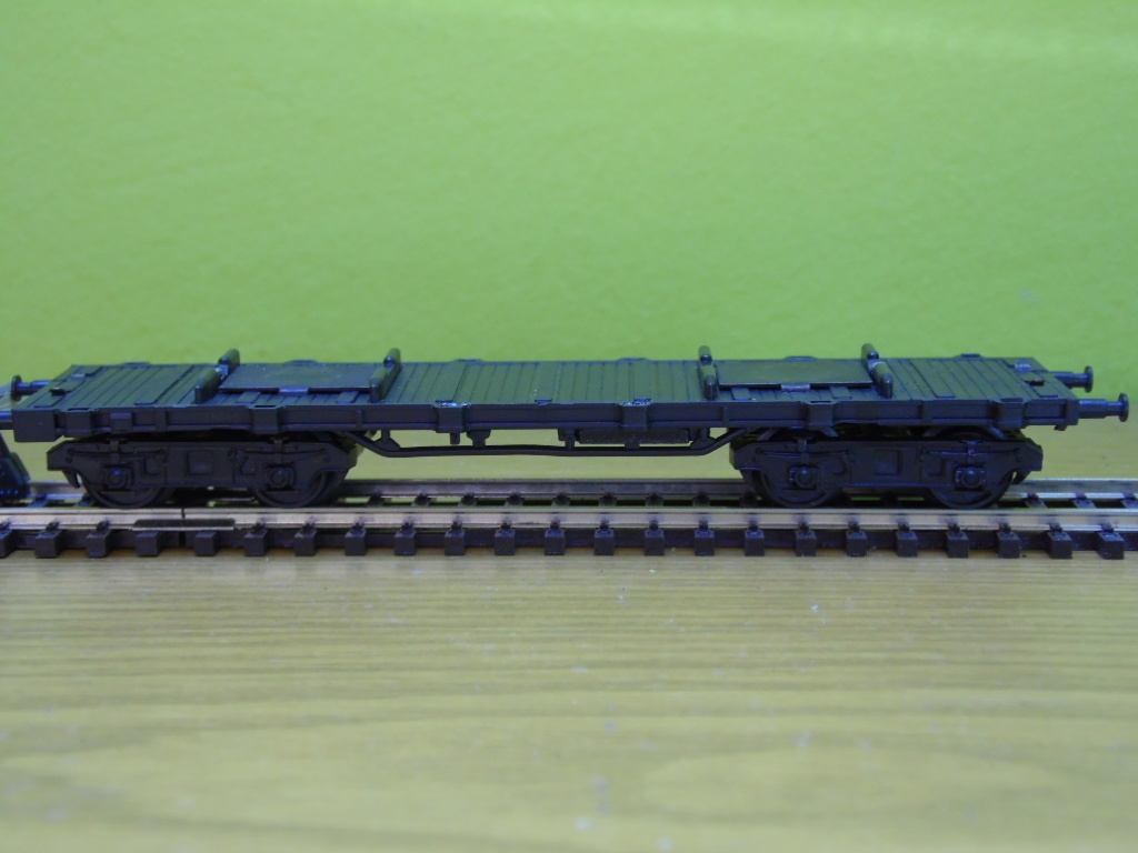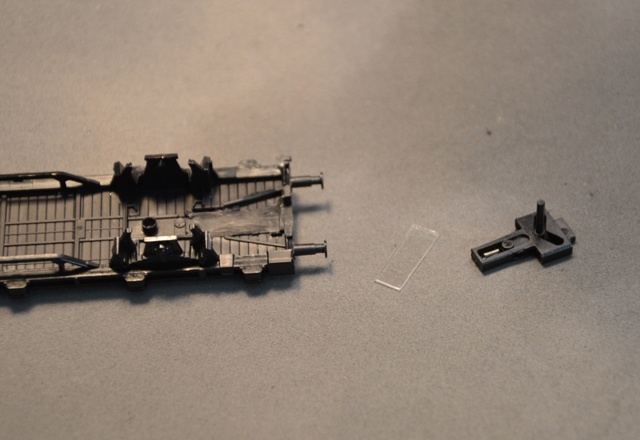 Egyszerű a menet. A gyári, egyébként fém rugó- és kapcsoló ház fogadására kialakított alváz részeket lecsiszoljuk, majd egy 0,5-ös műanyag lapka beiktatásával felragasztjuk a kinematikát. Előtte a kinematika front részén be kell csiszolni az aszimmetrikus fület, hogy pont beférjen a kocsi kapcsolójának fészkébe. Száradás után felmegy a NEM foglalat, pozicionálás és mehet bele a kapcsoló. Végül a két kerék is a helyére kerülhet. A konténerek ráhelyezésével kész a korszerű konténeres kocsi.  |