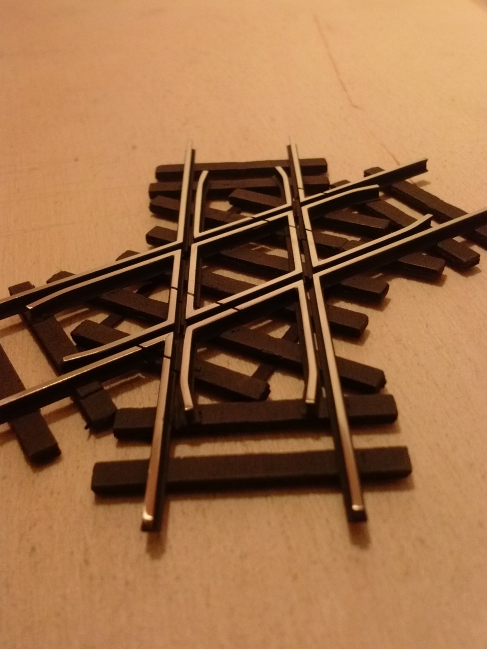 Nem tudom, hogy a kis nyák mennyire kell, vagy nem, ez egy kiforratlan dolog. Az a baj, hogy a nagy szög miatt túl kevés a talpfa a stabil megtámasztáshoz. A Fast Track-os sablon is elég hosszan megy ferde talpfákkal, mielőtt befordulna vágányra merőlegesre.