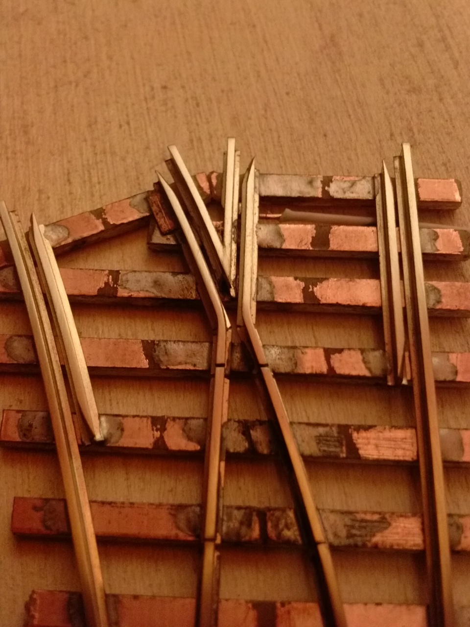 Új project vette kezdetét, mégpedig villamos kitérők. Tillig 2,5mm-es profilból készülnek, a kisebb 227,5mm ívsugarú 27,9° kitérésű, a nagyobb 272,5mm és 23,5°. A vágánytengely-távolság 45mm. Még szerencse, hogy van már sínhajlító készülékem, mert anélkül ezt a kis ívet nehéz lenne szépen meghajlítani. |
