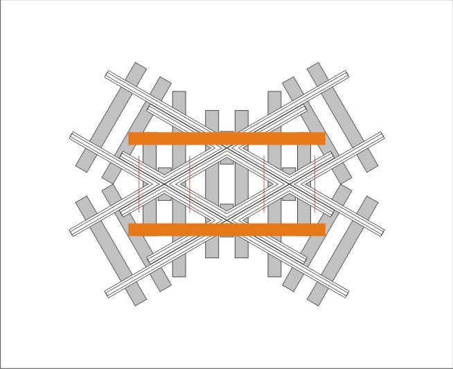 Rajzoltam egy újat, ezen besűrítettem a talpfákat, megnyújtottam a vezetősíneket, így nincs olyan rész a vágányzatban, ami csak egy talpfán lenne. Természetesen alul ezt is meg kell patkolni az utolsó egyenes és a ferde talpfa között. |