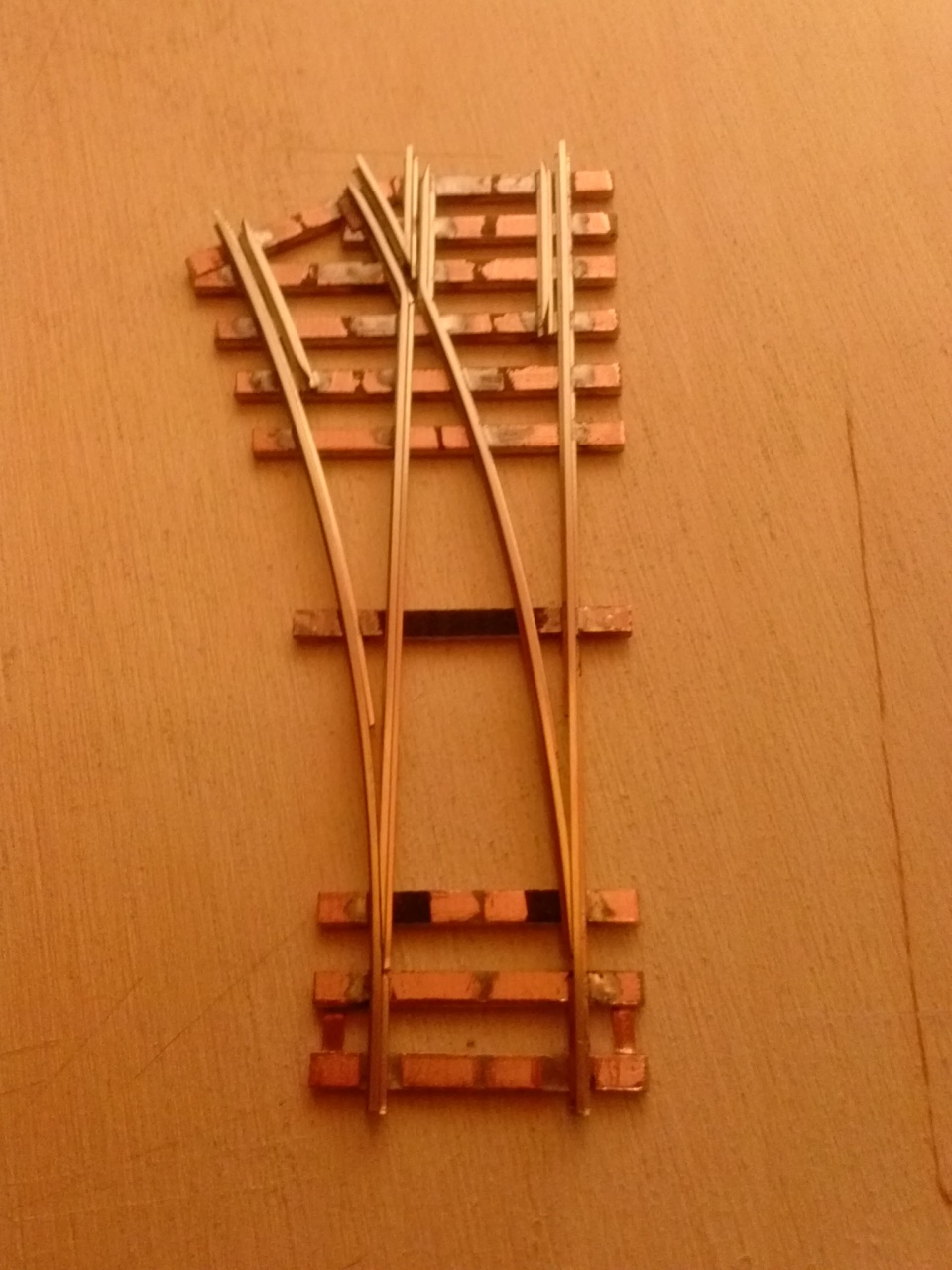 Nem tudom, hogy a kis nyák mennyire kell, vagy nem, ez egy kiforratlan dolog. Az a baj, hogy a nagy szög miatt túl kevés a talpfa a stabil megtámasztáshoz. A Fast Track-os sablon is elég hosszan megy ferde talpfákkal, mielőtt befordulna vágányra merőlegesre.