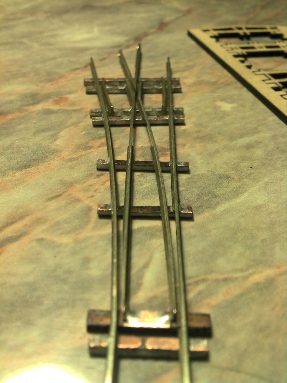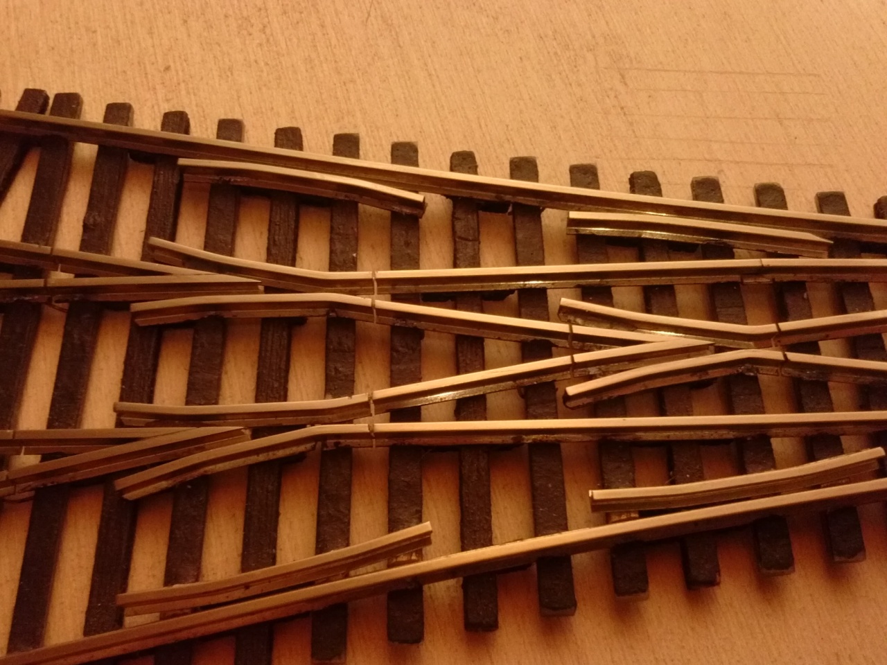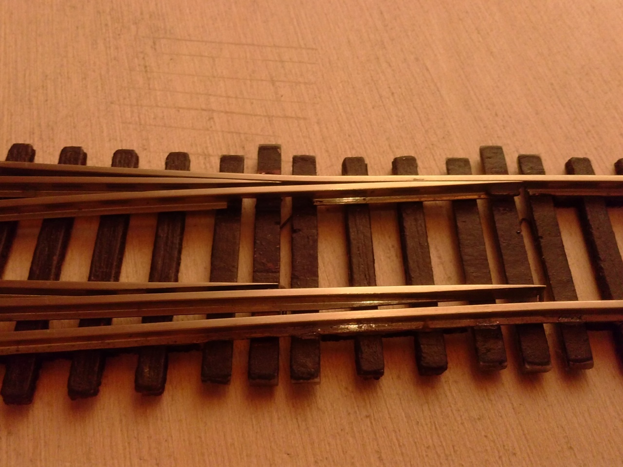 A két rövid csúcssínt vagy hosszan ki kell könnyíteni mindkét oldalon, vagy csuklópontosra kell csinálni. Én mind a négy csúcssínt csuklópontosra csináltam, bár az enyém Peco profilból készült. Erre figyelj majd oda, mert a rajz is Peco sínre készült. |