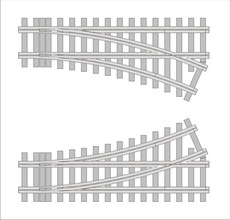 A két bemarás közül az alsóban az állító talpfa hosszát lehet levágni, a felsőben meg a vezetősínét, ha nem dupla sínes lesz a kitérő.
