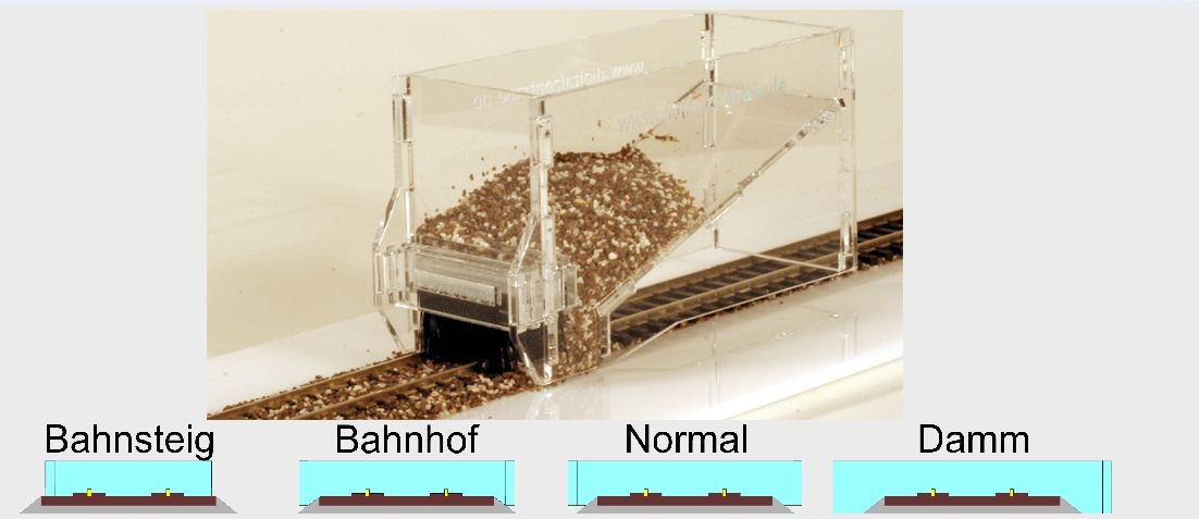 De ez csak tipp, nem próbáltam, csak akváriumkaviccsal (van 1-1,5mm szemcsenagyságú) végeztem tesztszórást U profilos sínen mindenféle ragasztás nélkül, de az eredmény meggyőző volt. |