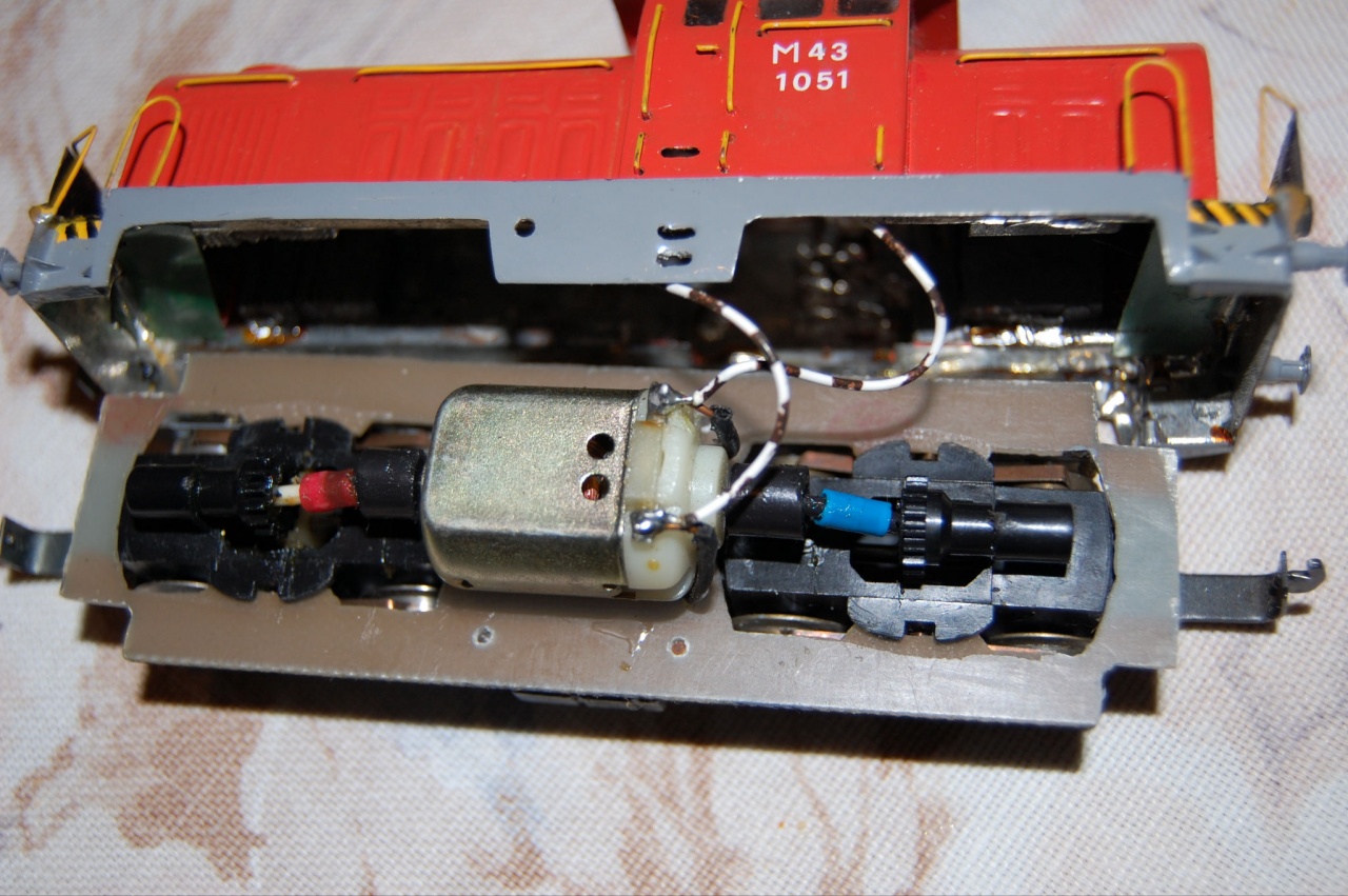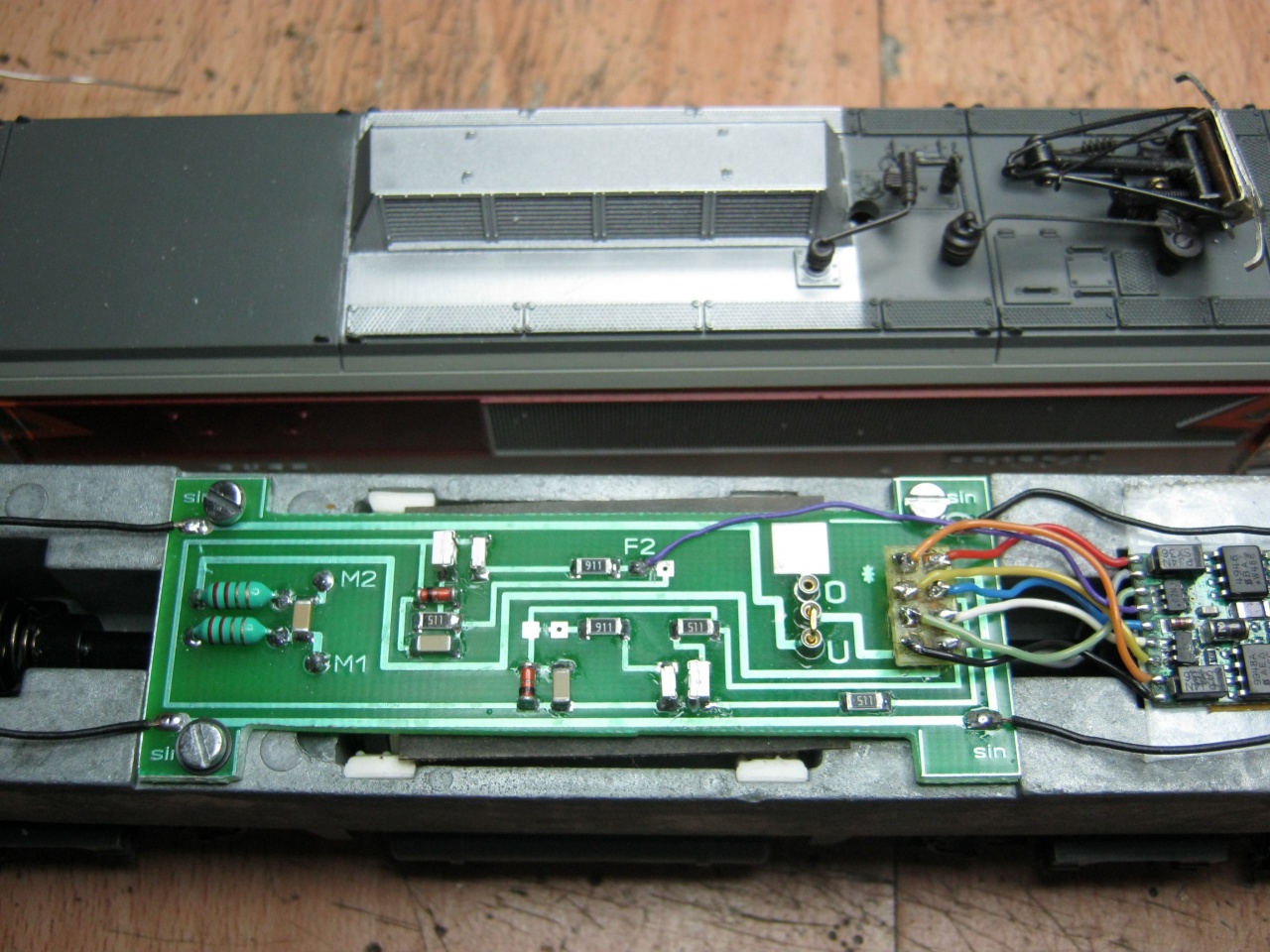 Kipucoltam a villamos rendszerét. Megkapja az SMD LED-es világítást, úgyhogy az eredeti lebontva. Az oldalsó vezetősín helyett szigetelt vezetéket építek rá, és lekötöm az áramszedő lemezekre a forgóvázon.