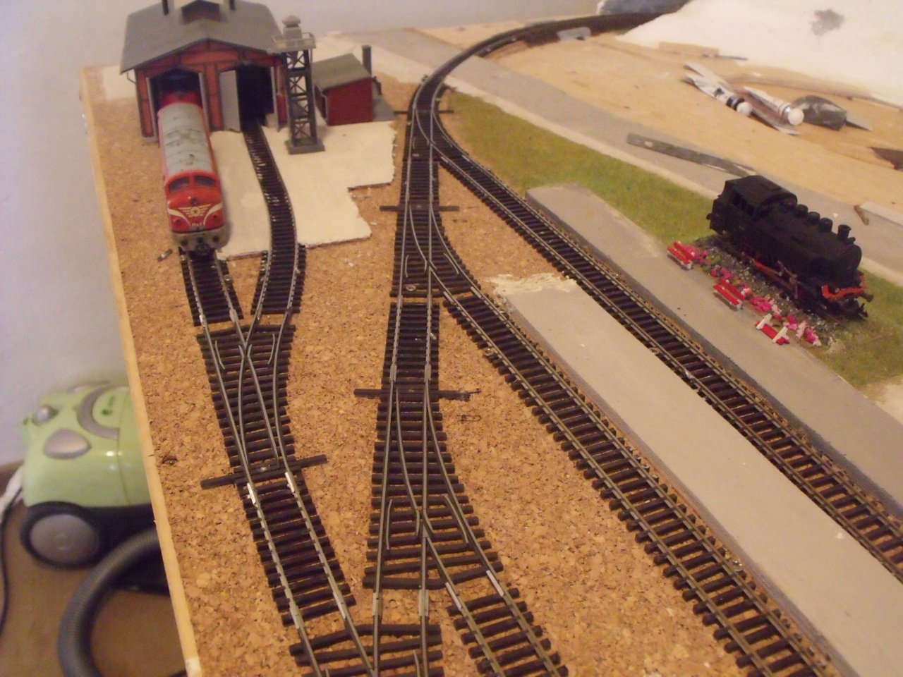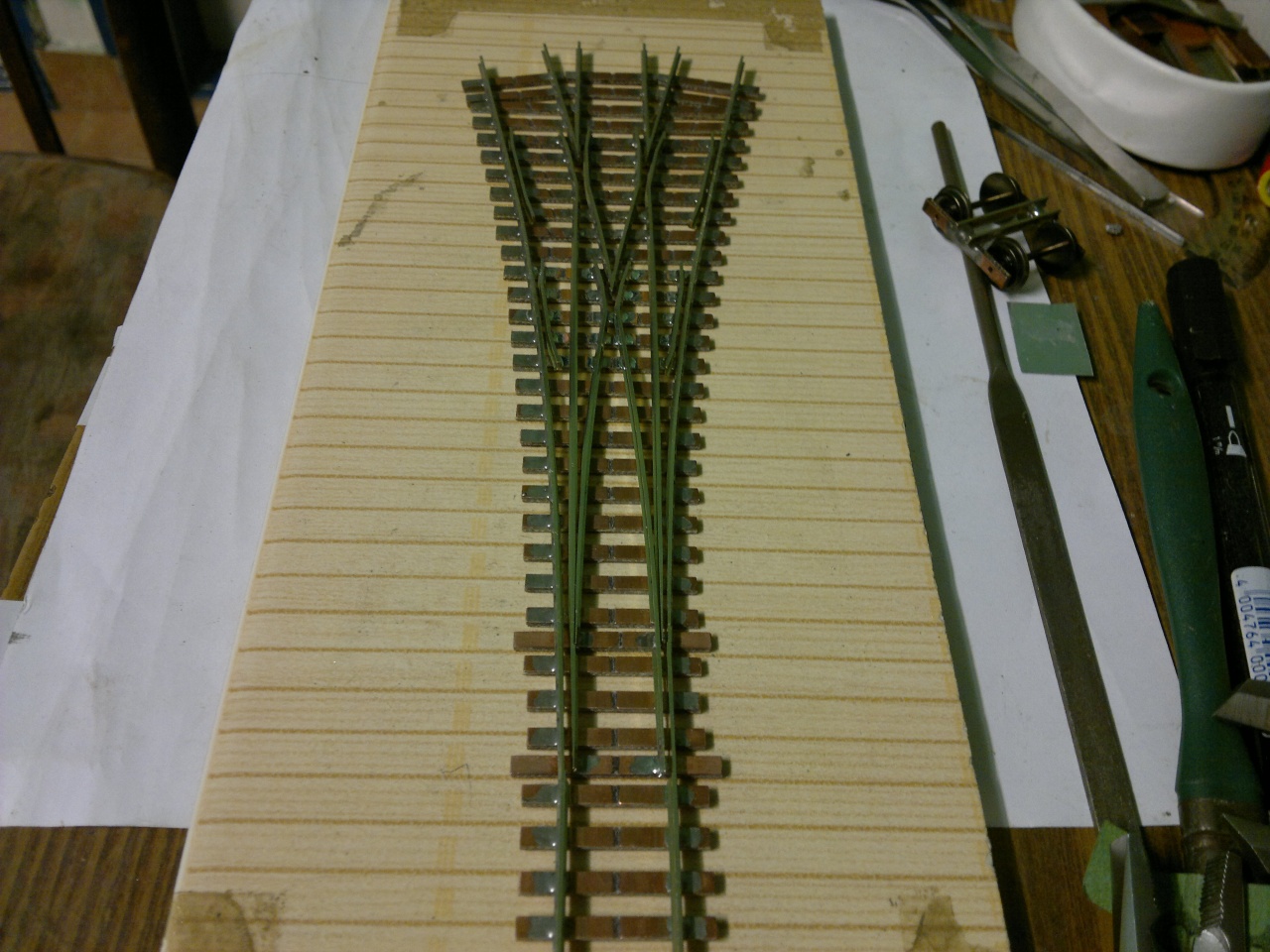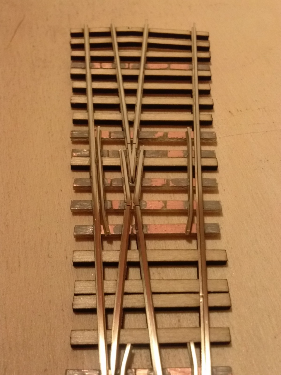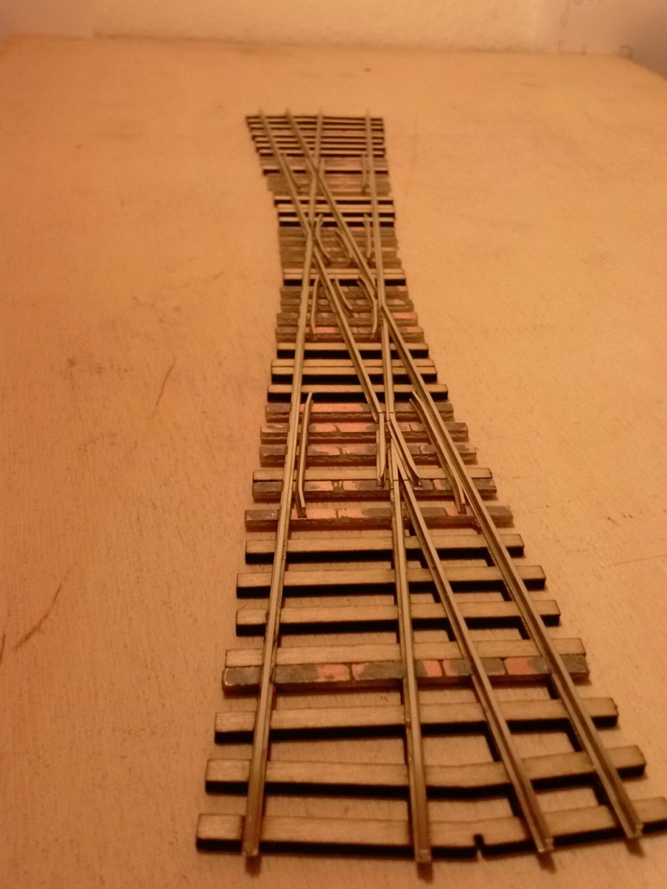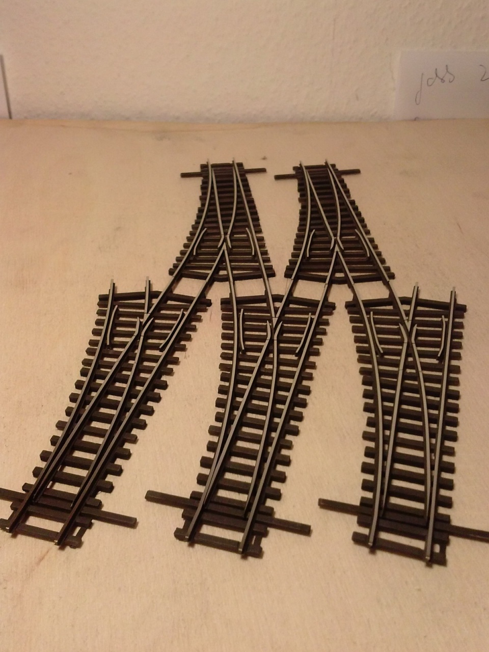 A villamos váltók 22 centis íveiből ideiglenesen kiszabadulva összeraktam a jóval lejjebb beharangozott H0-H0e 10 fokos átszelést. Sajnos modellezőtársunk ezt a darabot festés nélkül kérte  , pedig szívesen megnéztem volna lefestve!