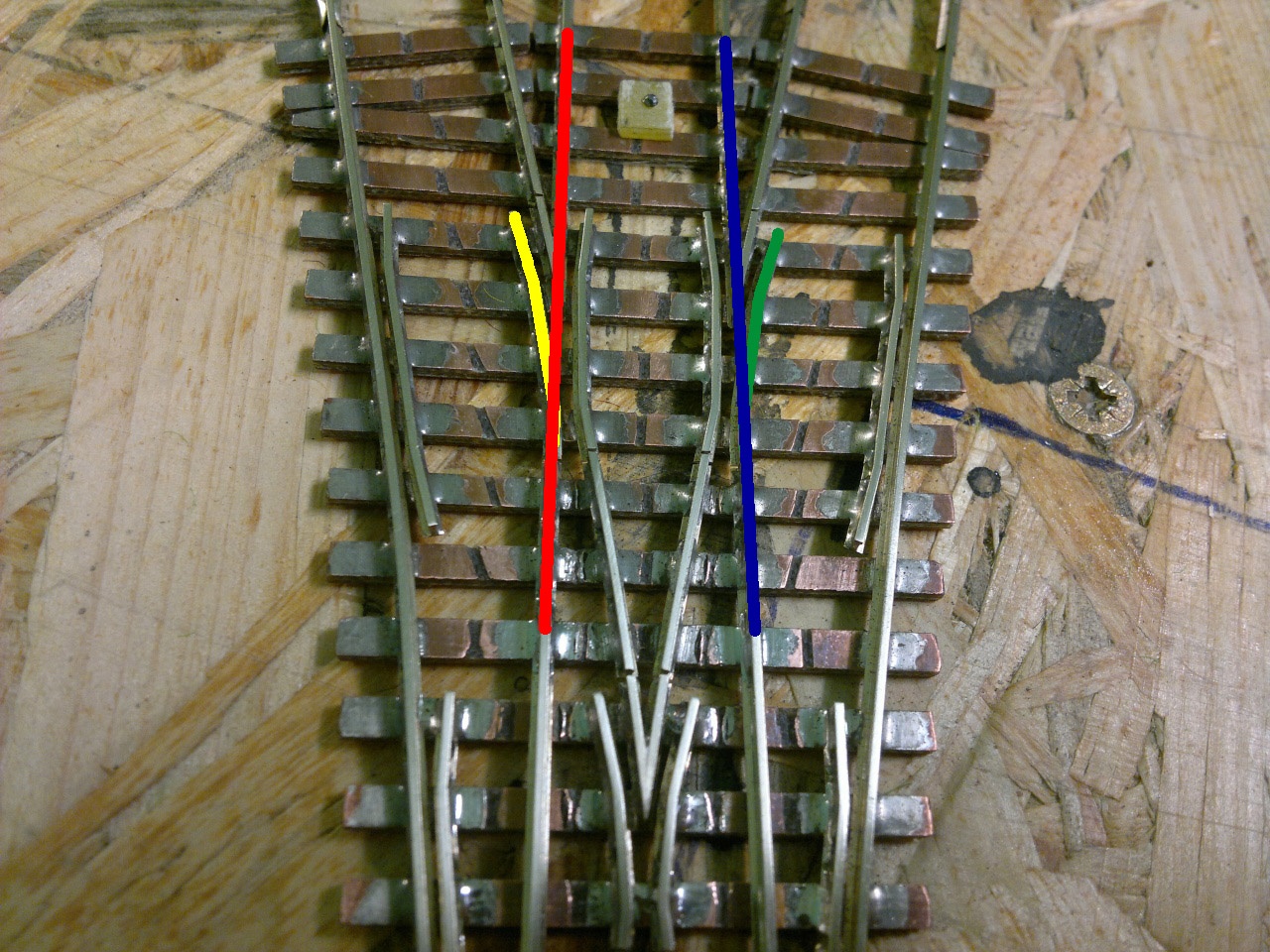 A balra kitérő könyöksín az egyenes irányhoz tartozik, nem a kitérő oldalhoz. Az 1,2mm-es hézag pedig akkor jó, ha a nyomtáv pontosan 16,5mm. A vezetősín-könyöksín egymáshoz képest külső oldalainak távolsága max. 14,1mm lehet.