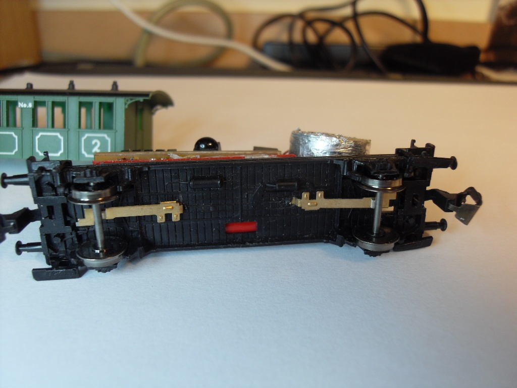 Ez természetesen nem elég a fedélzet áramellátásához, de két finom acél vagy bronzdrottal a kerekek belsöjén a tengelycsonkra nyomva elég megbizhato, és csak nagyon kicsit fékezö áramszedést lehet létrehozni. |