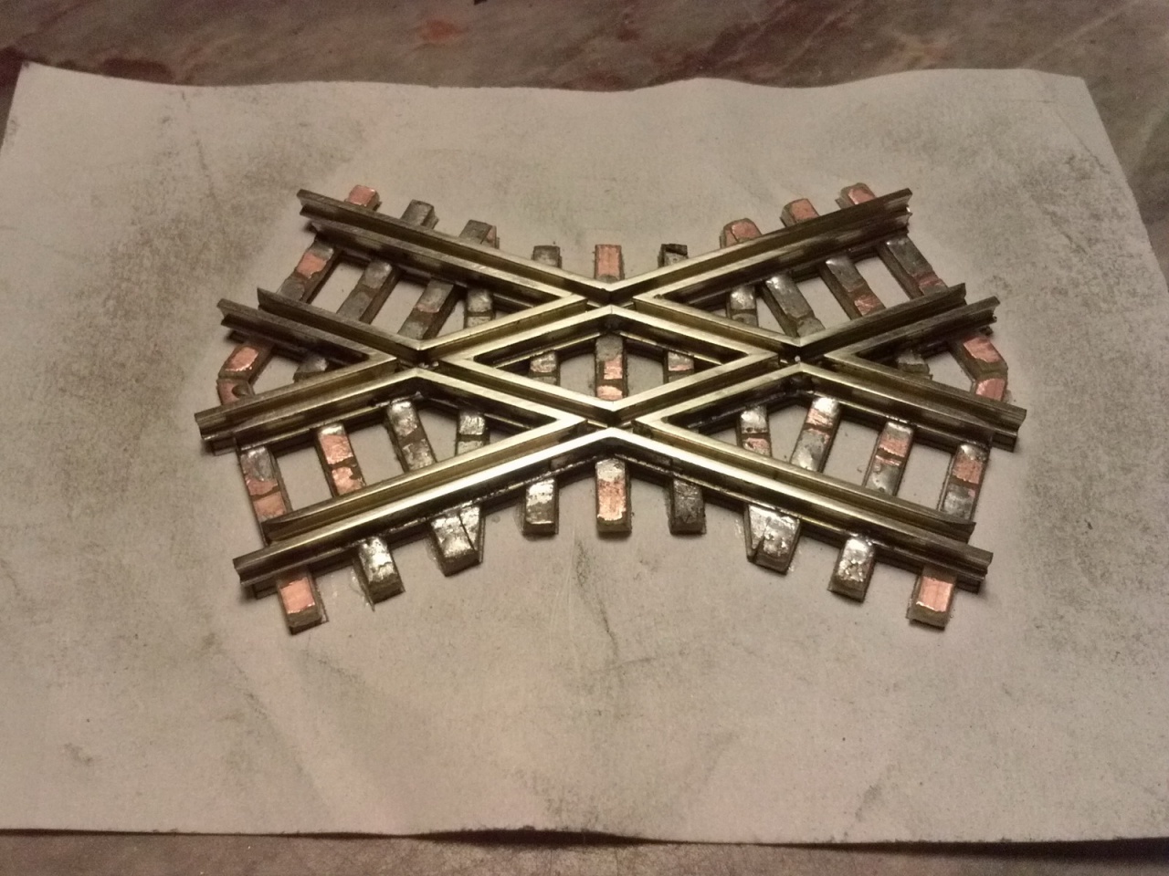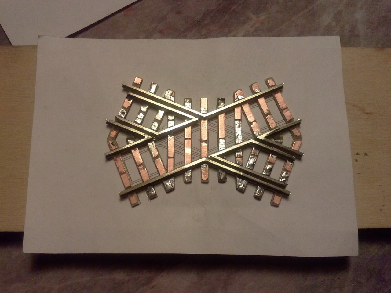 Nos, nem egyszerű a váltógyártók élete! A csodás kis TT átszelésemet a szigetekő vágások közben sikerült kinyírni! Az volt a probléma, hogy a szívdarab alatt találkozik két, egymáshoz képest szögben álló talpfa vége, ergó itt a réz réteg is meg van szakadva. Hiába van a szív összeforrasztva, fűrészelés közben egy picit egy erősebb rántásnál sikerült letépnem a rézfóliát a lapról. Miután a szív a szigetelő vágás után elég kicsi, az már nem lehetett megmenteni, így csináltam egy újat. Úgy gondoltam, hogy egy kis lemezdarab segítségével hozzáforrasztom a könyöksínhez, de ez sem működött, mert a szívdarab forrasztása is megolvadt, mire a cin rendesen megfolyt a két sínszál között, szóval az első példány kuka!