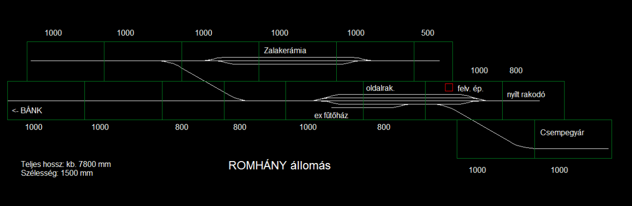 Egyébként Romhány sem 100%-os, a III-IV. vágány 182 m-es használható hosszát vettem alapul (az I-II. vágány csak 162 m-es lenne, na ennyit számít a hossztorzított váltókörzet: kb. ugyanolyan hosszúak), illetve kicsit variálnom kellett a Zalakerámia vágányainak hosszával is, hogy arányosabb legyen (a Google Earth-ben mért vágányhosszokkal majdnem a peron elejéig* belógott volna a kihúzó felőli váltókörzet).