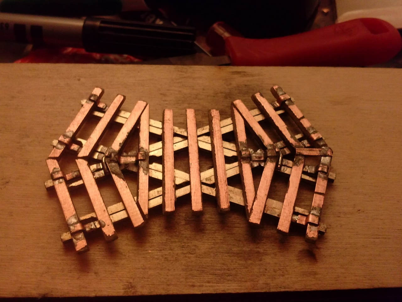 Az az igazság, hogy a méreteken kívül nem sok közös van a két kitérőben, tehát a koppintás sem állja meg a helyét, mert ezt én terveztem. Más a szívdarab (a Busch 22,5 fokos, az enyém 16, ahogy az ív kívánja), más a csúcssín kialakítása, a talpfaelrendezés is kicsit más, és ez alatt nincs vaslap, ami a Busch lényege.
