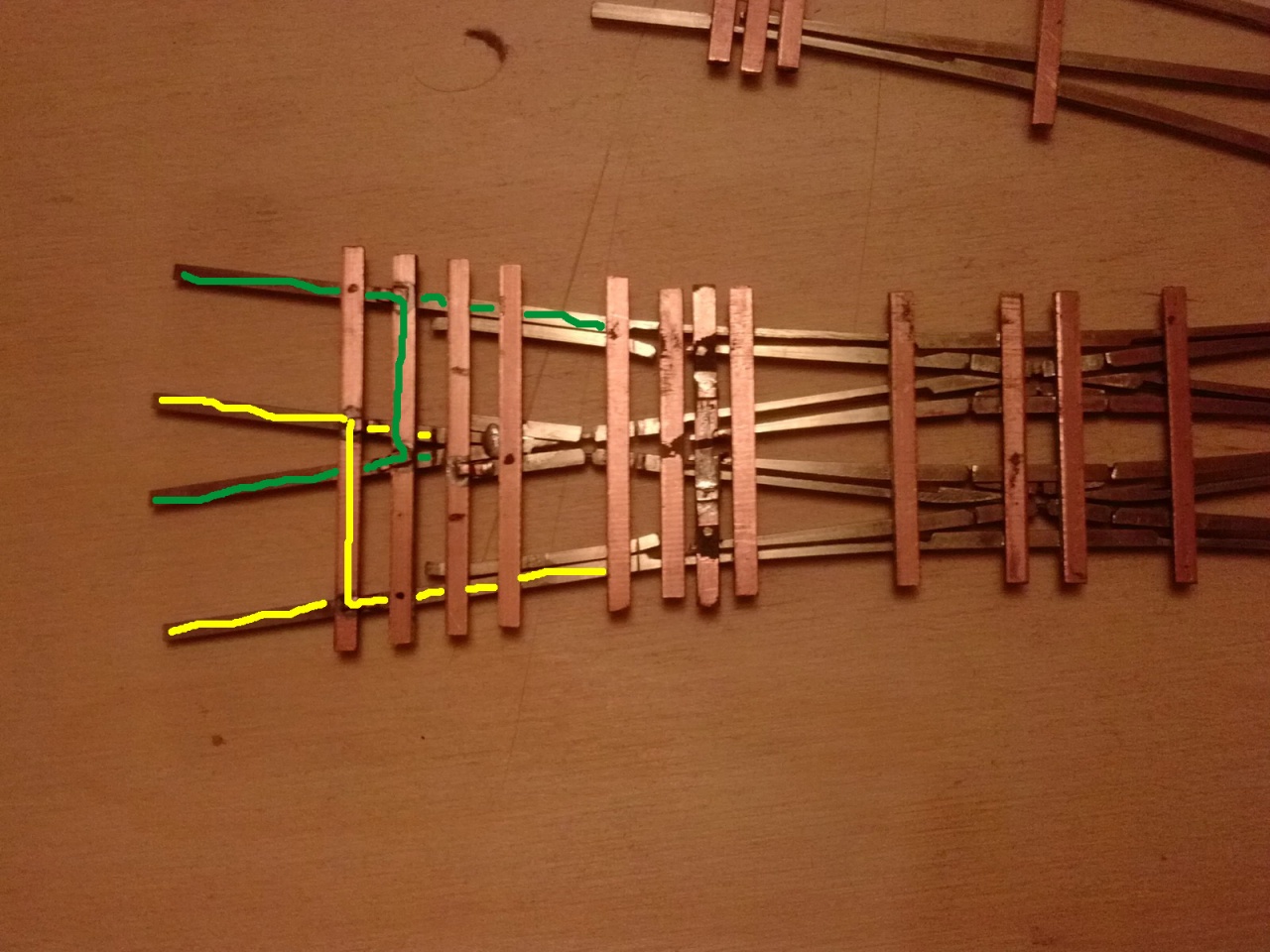 Amíg a kis TT háromutas kitérő, és a Fugi hózentróger festés után szárad, elkezdtem három H0 íves kitérőt. Ezek 605/907mm ívűek, és a szívdarab 9 fokos: |