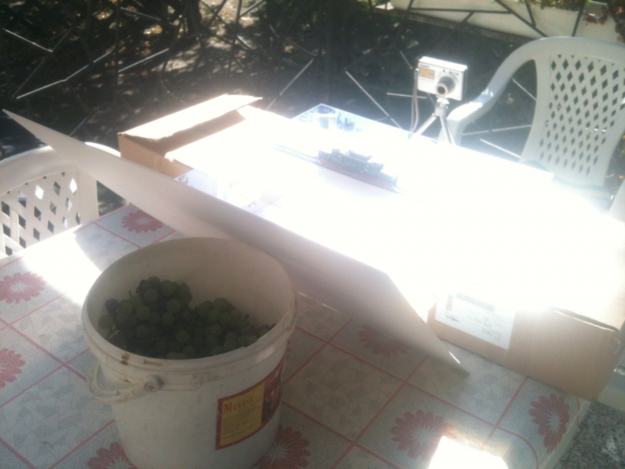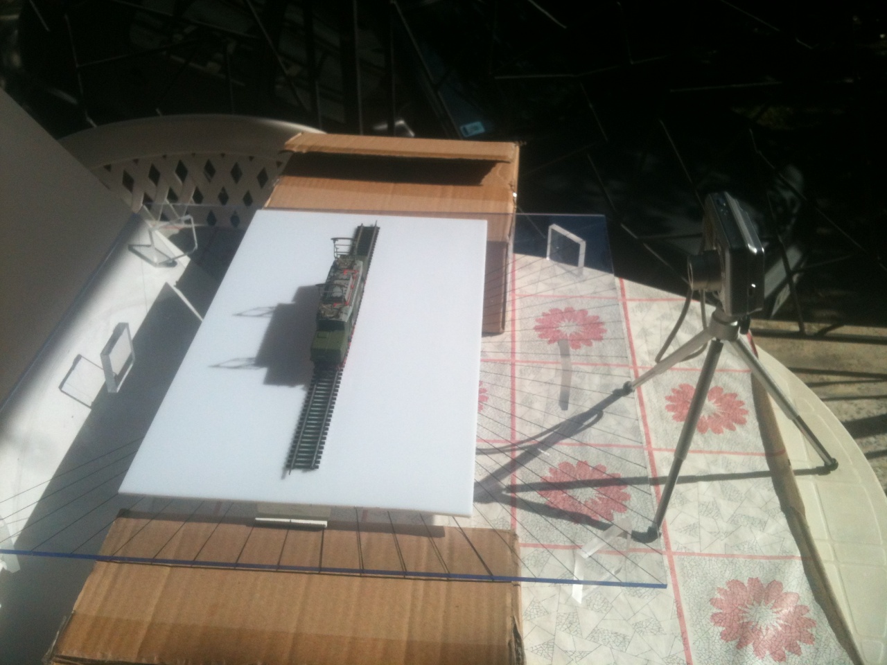 Igazából az történt, hogy 7x72 képet készítettem mire belejöttem, hogy hogyan is lenne jó, mert a saját kezűleg készített forgató berendezés, elsőnek visszaverte a fényt, ekkor került rá a tejfehér plexi. (Az első képen látszik, hogy a mozdonyra is feltükröződött a beosztások vonala.)