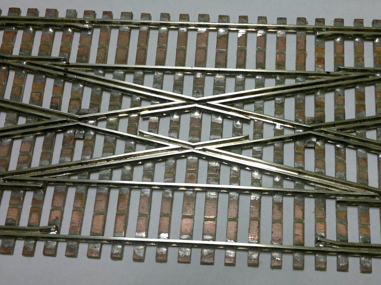 Újabb gödöllői project, ROCO 10 fokos geometriájú hózentróger két angolváltóval. A hármas kitérőt még Tillig 2,07-es profilból építettem, de szerencsére megérkeztek a PECO IL-115-ös profilok, amelyek a legjobban hasonlítanak a ROCO igen amorf sínszálaihoz. A talpa ennek is keskenyebb, mint a ROCO-é kb. 0,2mm-rel, de legalább a sínkorona szélessége megegyezik, és a magasságbeli eltérés 0,03mm, ami ebben a léptékben is a semmivel egyenlő. |