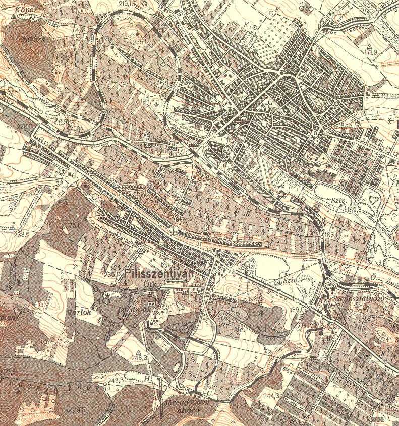 No, egy kicsit volt ma időm rendesen utánanézni a dolgoknak. Pilisvörösváron nem rakodtak szenet, pontosabban nem az állomáson. A képeken is látható átrakó valójában a településtől nyugatra található dolomitbányából (Ez kb. a mai Terranova területén volt) érkező anyag átrakására készült. Azt jól sejtettem, hogy bányavasút is volt itt, mely részben a település főutcáján haladt ( térkép I.).