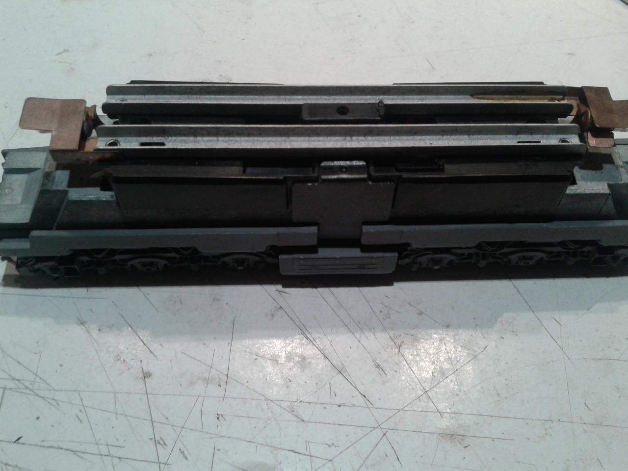 Mindkét hajtott forgóváz önnállóan is működik. Akaszd ki a szénkefe nyomó rugókat egy csipesszel, és vedd ki a szénkeféket. Ha kinnt van ellenőrizd, a kerekeket forgatva, hogy melyik forgóváz és melyik irányba "zörög". Ha a forgóváz alján lévő másik csavart is kicsavarod, akkor az egész külső "díszítés leszedhető és csak a mechanika van elötted.