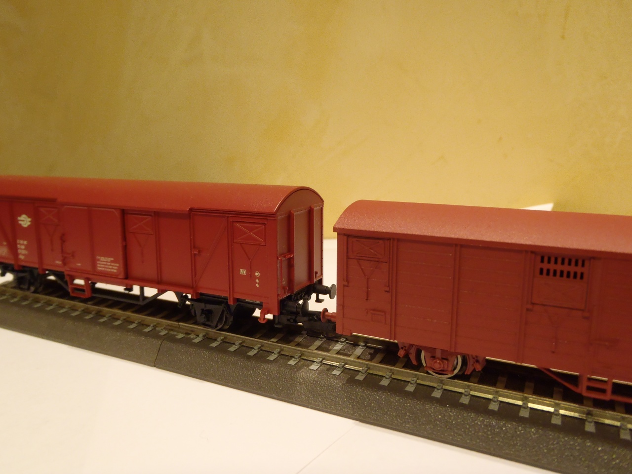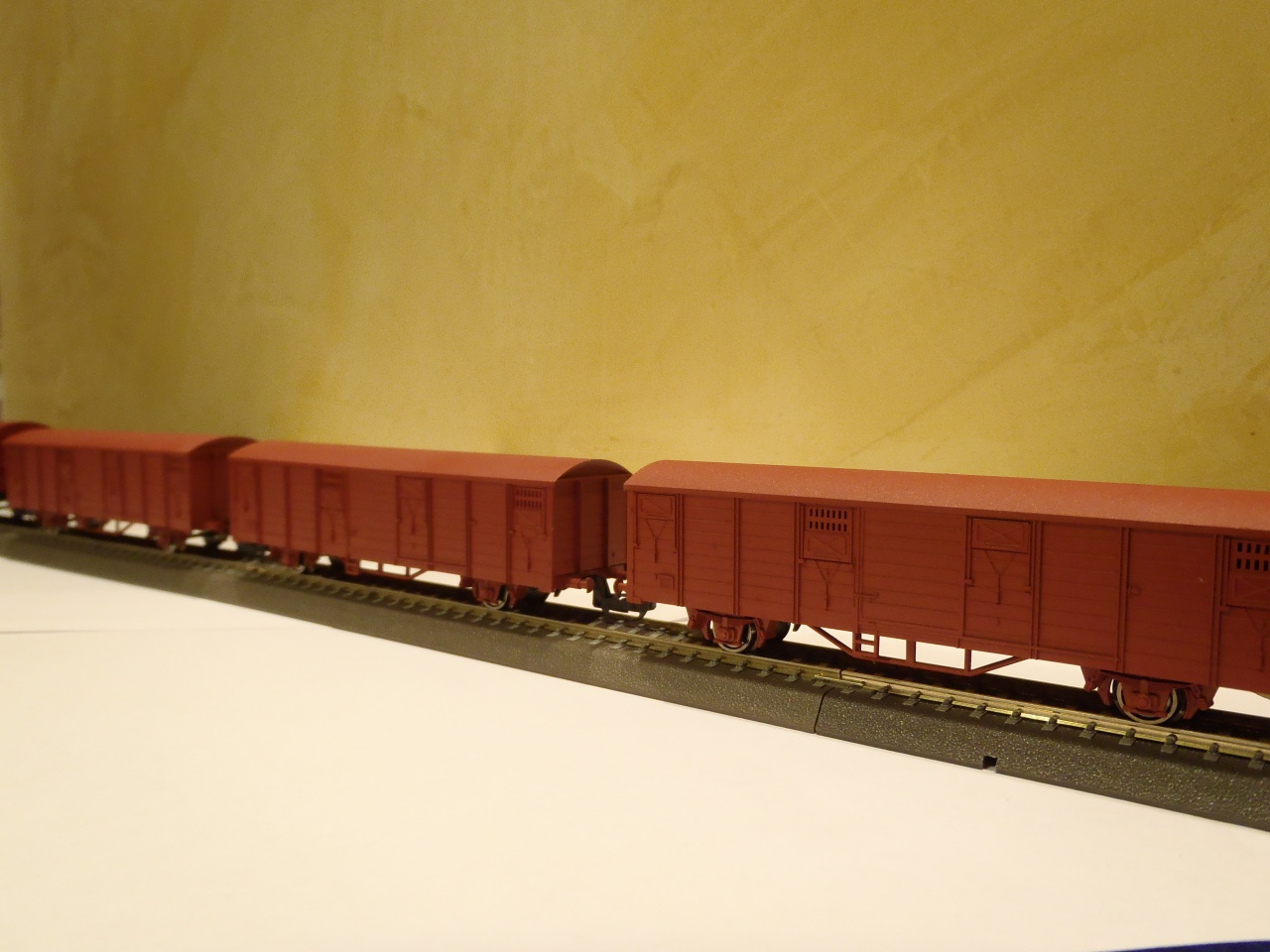 Festegettem egy kicsit a hétvégén. Elkészült az első 3 BTTB alapú Gbs kocsi átfestés. Egy árnyalatnyi színkülönbség van a 3 kocsi között, mert direkt így kevertem festéket. Mellettük a Tillig féle MÁV Gbgs viszonyítási alapnak. Már csak a tamponnyomás hiányzik róluk. |