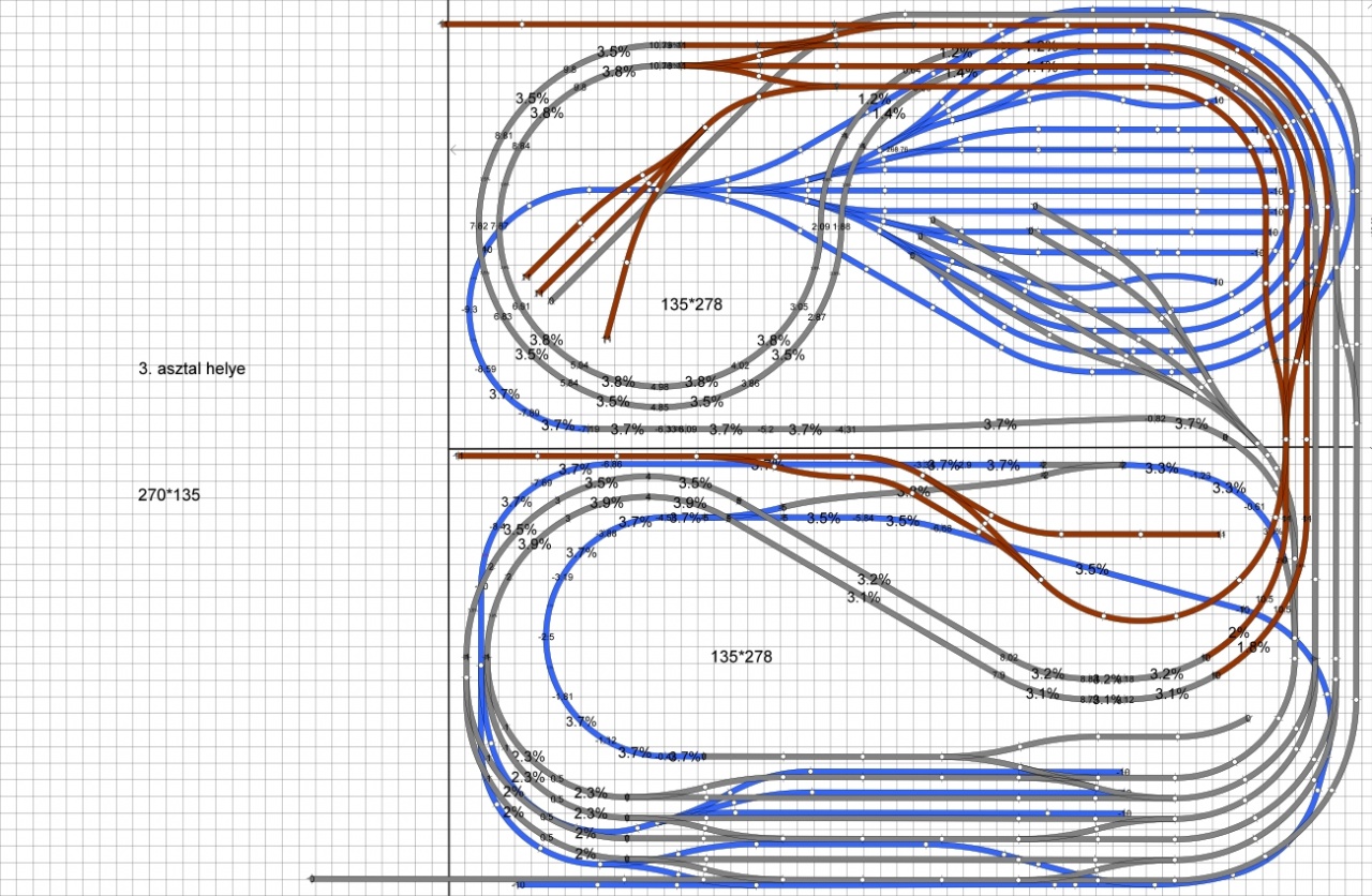 Elkészültem egy tervel ami alfábol bétává avanzsált. 3 szint, viszonylag kis helyen. H0 méretarány, PIKO A sinkészletből építkezve. Emelkedők mindenhol 4% alatt! Jelen állapotban 123m hoszzú vágányzat, 51 kitérő. Egyenlőre 2 asztalt épitek. Egyenként még mozgatható, szállítható méretüek egy esetleges költözés esetén. Tervbe van véve egy 3. asztal készítése, annak helyét belekalkuláltam, átvezetések késöbb könnyen kivitelezhetőek. Vannak dolgok amiket szerettem volna, de nem volt neki hely (pl.: fordító korong), ezért esélyes késöbb a megépítése.