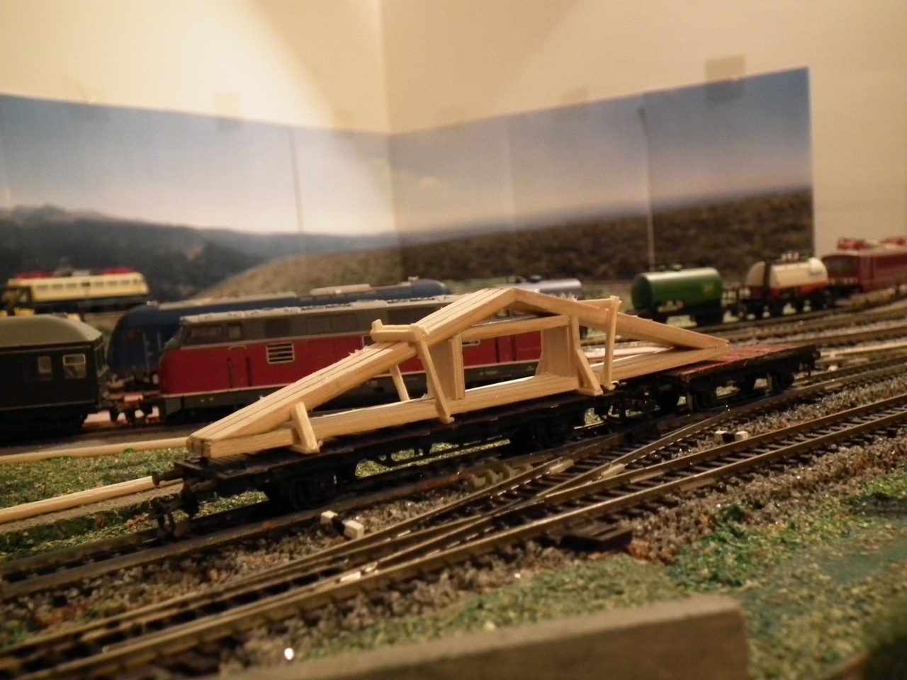A modellben ( magasfalu kocsinál ) pl elég a 1-3 felsö réteget megcsinálni alatta meg egy hungarocell vagy szivacsdarabka lehet. Ha látni a rakományt oldalrol, akkor meg kell csinálni az egész rakományt. Ilyenkor nagyon kell ügyelni a deszkák méreteire ( vastagságára, szélességére - és inkább a vastagabb fosznikat modellezd pl 2"x8" deszkák kicsinyitett modelljeit.). A finomabb deszkák már nem mutatnak jol a modellben.