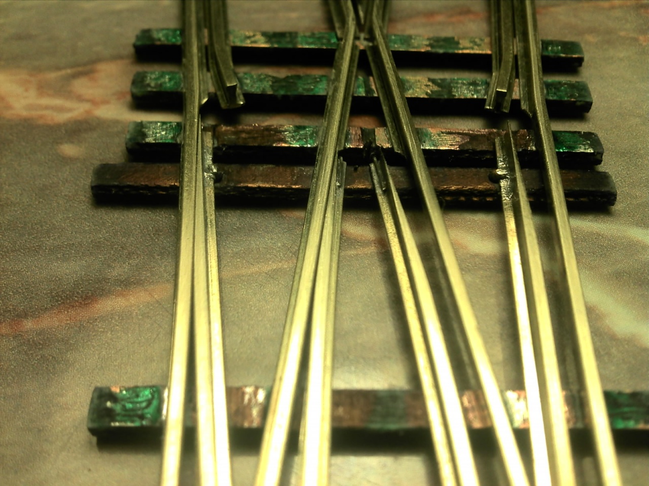 A másik, hogy a gyökcsapos csúcssíneket rögzíteni kell. Régebben azt is acélszállal oldottam meg, ahogy a képen van, manapság már egy vékony rugóbronz csíkot forrasztok a sín oldalára a hajlás szerinti belső oldalra, úgy, hogy csak a két végét forrasztom oda, és a csík legalább 10mm hosszú. Ezek, azon kívül, hogy helyén tartják a csúcssínt, még a tökéletes áramellátásról is gondoskodnak. |