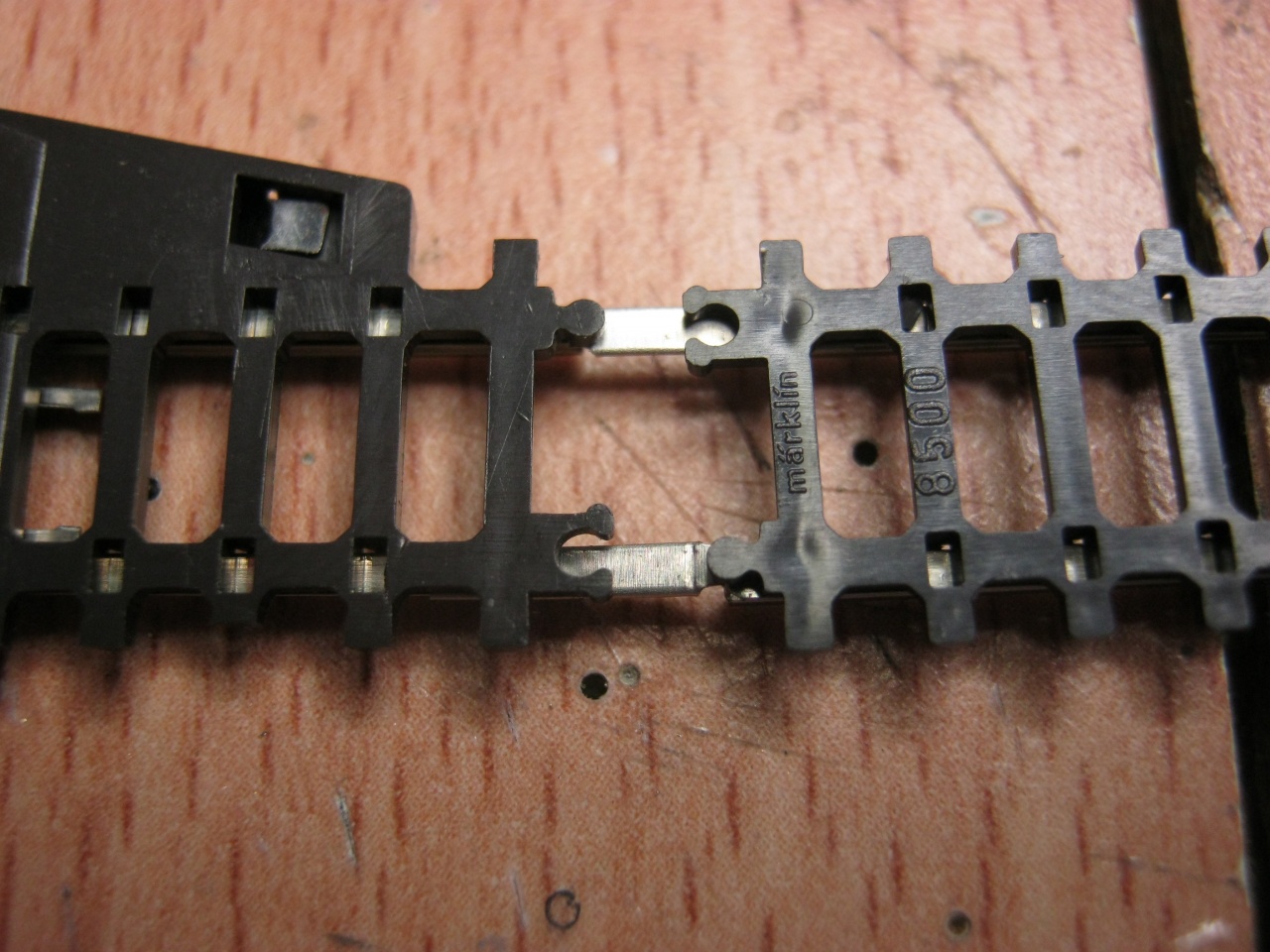 Majd lefotózom, és átküldöm, vagy adok is majd egy Märklin Z sínt. Ugyanis a Märklin sínek mechanikusan is rögzülnek egymáshoz. A talpfarács "hossztartójának " az egyik vége "papa", a másik "mama", így, amikor összetolsz két síndarabot, vagy a váltóhoz egy sínt, akkor nem csak a papucsok fogják meg a sínszálakat, hanem a tapfarácsok is egymást. |