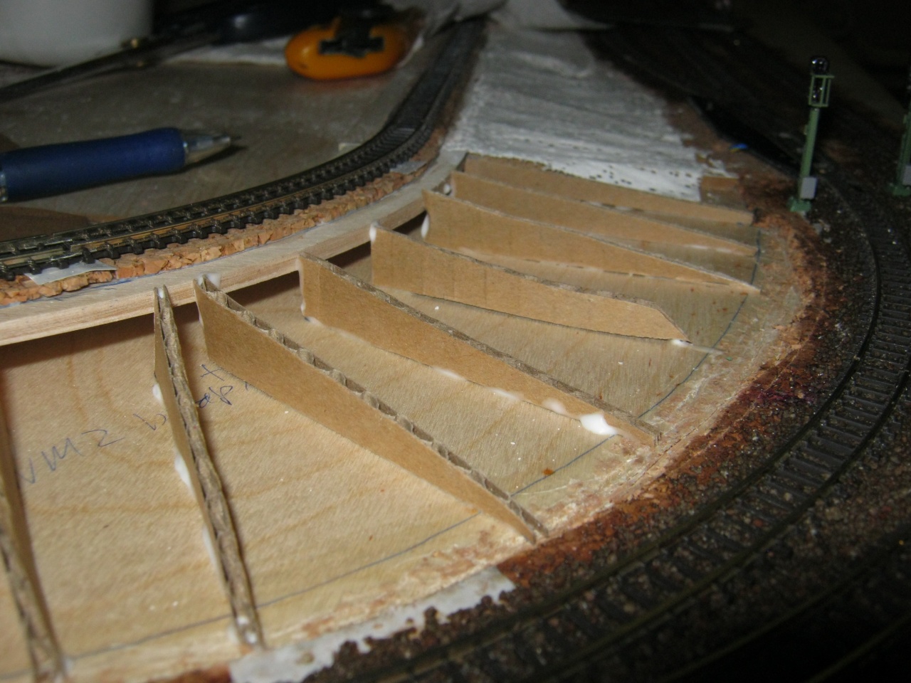 A vázszerkezet sima hullámpapír, a közük ki lesz töltve papírral, majd kap egy gipszpólyát, a háttérben már fehérlik. |