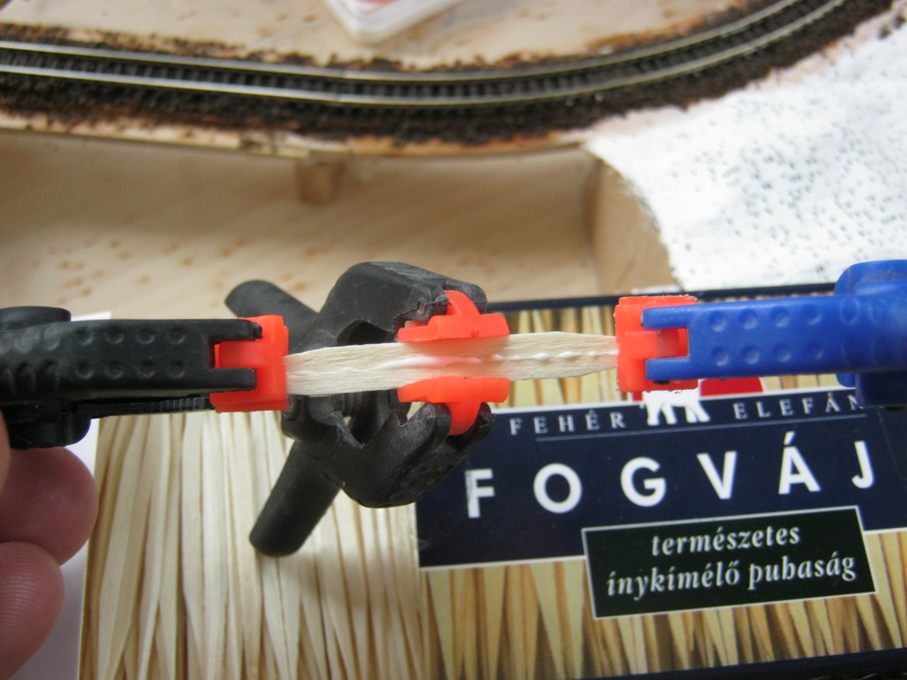 A kapcsolósínek okán keseregtem a Märklin sorompóján, amit be kell építeni. Nos gyári állapotban eléggé lehangoló, és mivel összesen így adják (a dobozon kívül), így a gépkocsivezetők dolga eléggé nehéz lesz, átjutni a síneken, lásd 1739-es képet. A megoldás, a fogpiszkáló, ez a lapos tipusú. Kettő öszeragasztva, és méretre csiszolva, a 1741-es képen. A helyére is került, majd közönséges vízfestékkel be lett festve - okker, fehér, fekete, keverve. Ugye így már kicsit más, a 1745-ös képen?  A festék még szárad, így a hiányzó ágyazatanyag pótlása egy kicsit későbbre marad. |