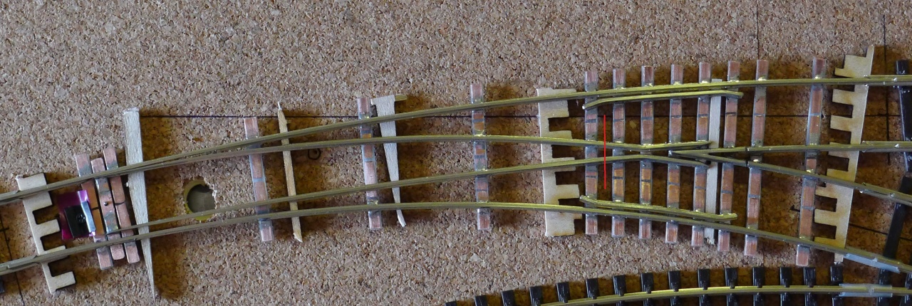 2. A szigetelt kialakítás. Előnye, hogy a csúcssínek folyamatos áramellátást kapnak, nem a csúcssín-tősín kapcsolaton múlik a dolog, és mindegyik csúcssín a saját oldali tősínnel azonos polaritással rendelkezik, ergó felvágható a kitérő. Hátránya, hogy a szívdarab alaphelyzetben egyáltalán nem kap áramot, lévén itt zárlat keletkezne, ezért ki van szigetelve. És itt van a kérdésedre a válasz, tehát az egy szigetelő vágás, és csak a szigetelt kialakításnál kell. Én mégis ezt preferálom, mert jóval stabilabb elektromosan, és a legtöbb kitérőnél olyan rövid a szigetelt rész, hogy nem jelent gondot a mozdonynak az a pár tíz milliméternyi szigetelt szakasz.