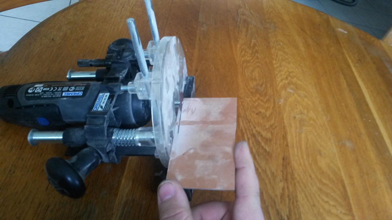 Szerintem egy kisebb fűrésztárcsával(kb.100-as átmérőjű,1-es vastagságúval) működőképes lehet a dolog.