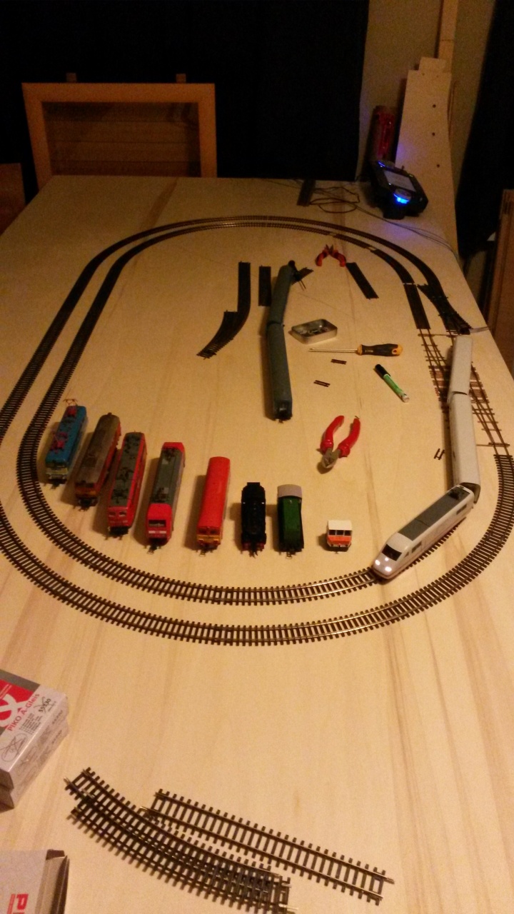 Mivel még nincs hova beépíteni, ezért összedobtam egy kis tesztpályát, pluszban 1-2 gyári kitérőt is beillesztettem, hogy legyen mihez viszonyítani. Csavarokkal kipeckeltem a váltókat kitérő irányba. Így az átszelés is használva van mindkét irányból, ráadásul folyamatosan tudták róni a köröket. Illetve tudták volna, mert volt néhány siklás, de nem azon amit készítettem, hanem a gyári váltókon!!! Elkezdtem végigpróbálni az itthon fellelhető összes mozdonyommal, oda-vissza, a legkisebbtől a legnagyobbig, lassú menetben és a leggyorsabban is.