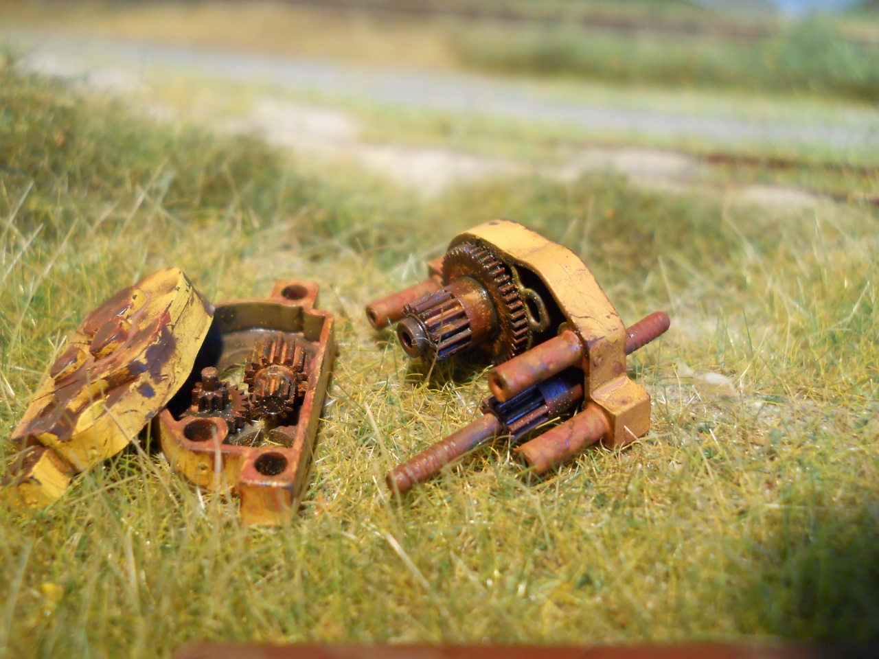 teljes száradás után a sárga festéket drótkefével kezdtem nyomkodni, ezáltal karcolások, lepattogzások keletkeztek a festéken. Ezután hígított rozsdaszínnel átmostam a felületet, így a karcolásokba beleült a rozsda. Ezt követte egy kis száraz ecsetelés, illetve a fogaskerekekre és a deknikbe egy kis gépzsír lerakódás felvitele.