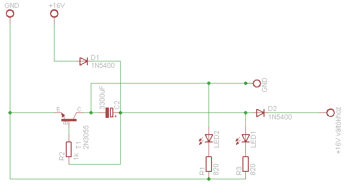 2. Ha lecsökken a kondi feszültsége és fennáll a terhelö áramkör, akkor csak egy meghatározhato áram folyhat ( 2-300mA), és ezt az állapotot ki kell jelezni - piros LED.