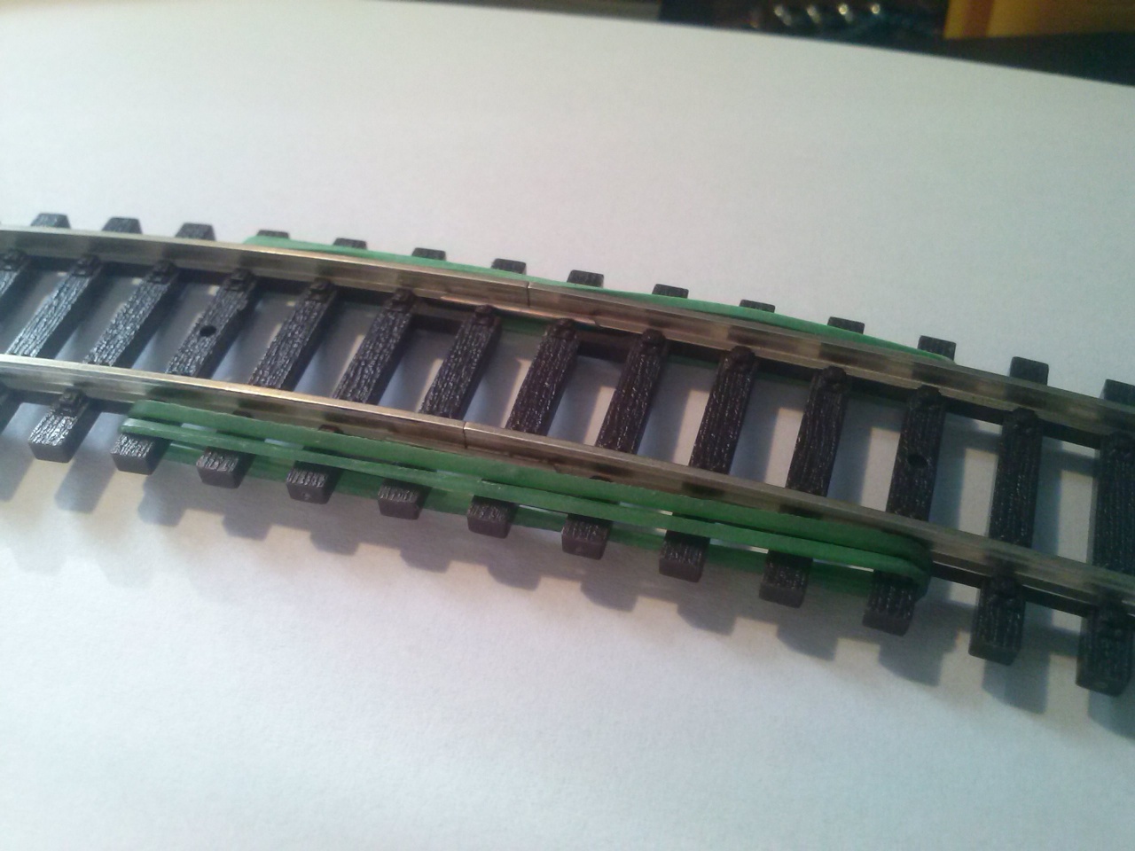 Én egyrészt váltókészítéshez csináltam (most épp íveshez kell), másrészt jobb, ha a flexi sínt nem csak a szög/csavar tartja az ívben az asztalon, hanem magától is úgy állna. |