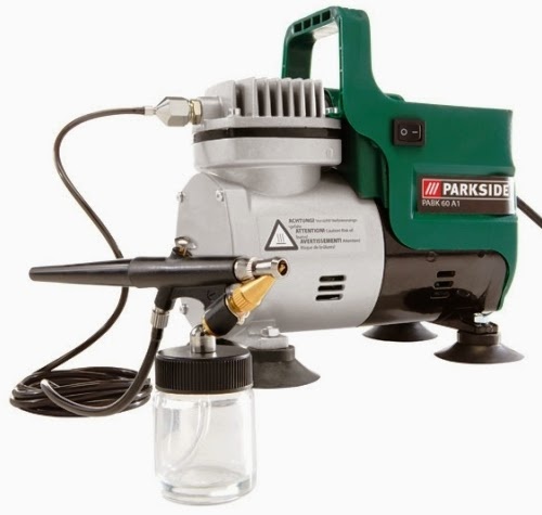 LIDL-ben találtam Parkside mini kompresszort, alsó, kis üveg tartályos airbrush pisztollyal. Mindössze 60 eurót kérnek érte!