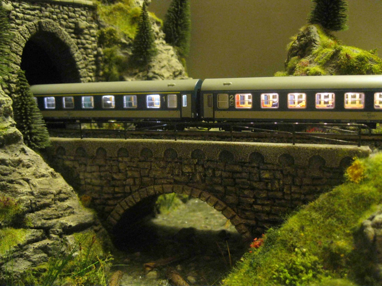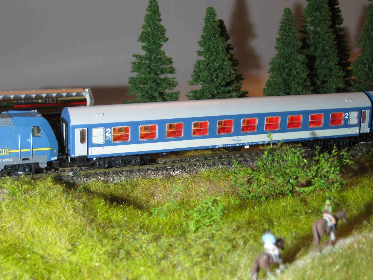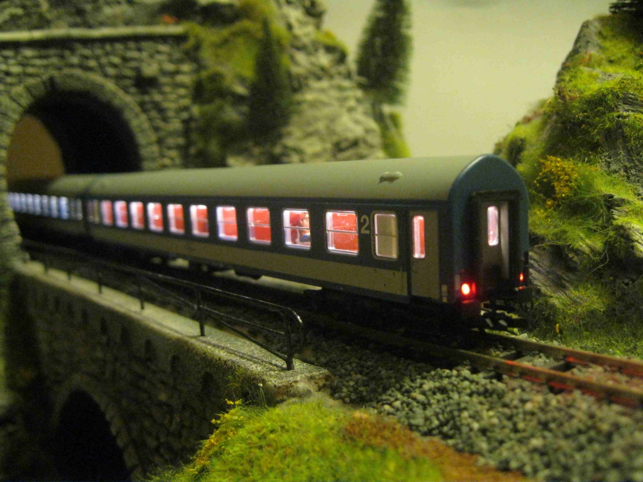 Hétvégén beépítettem világítás panelemet a Kühn féle Y kocsikba. Technikailag nagyon jól kialakított az áramszedés. A fülkébe külön huzalon vezetik fel a kerekekről a sínfeszültséget, mind a négy tengelynél "szedi az áramot", kétoldalon szigetelt kerekeket használnak. Így üzembiztonsága kiváló. Azért raktam pufferkondenzátort is a panelre, a WC fülkébe (ahol a WC és mosdó imitáció is megvan) befér. Kedvcsinálónak egy kép. A világításnál kidomborodik a belső berendezés piros (2. osztály) és zöld (1. osztály) színe. |